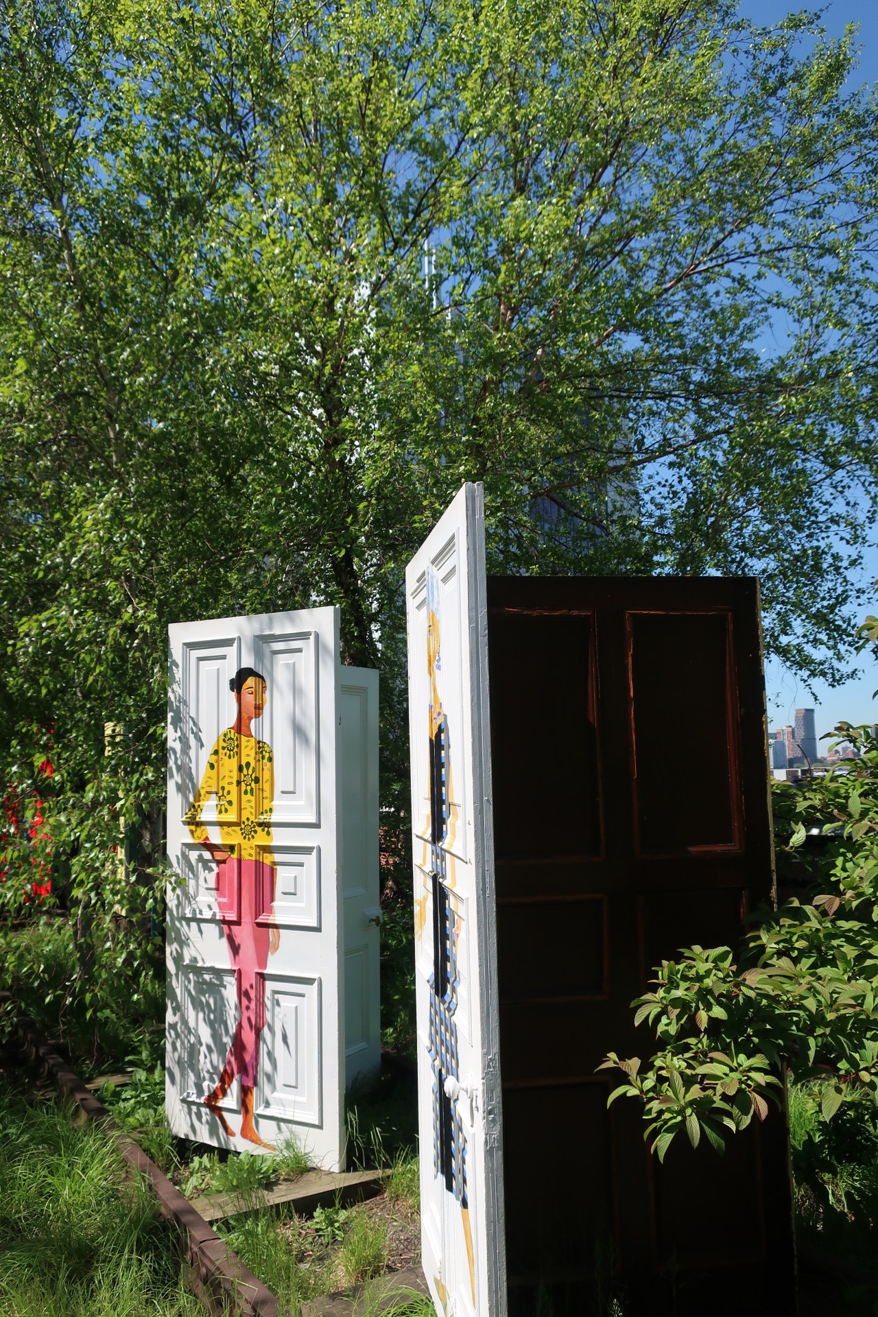 On trouve le long de cette coulée verte les anciens rails qui par moment disparaissent ou réapparaissent. Ils peuvent être agrémentés de portes en bois blancs qui dessinent des femmes qui marchent en jolies tenues d’été.