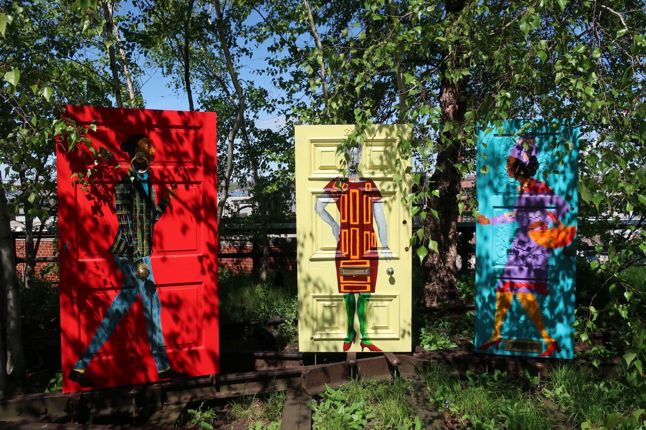 Elles sont sous des arbres dont les feuilles viennent juste d’éclore et le ciel bleu rend cet agencement printanier et frivole. On se croirait à un défilé de mode. D’autres portes sont peintes en rouge, jaune ou bleu turquoise avec des femmes de couleur défilant dans leurs robes aux tissus africains – boubous rayonnants. Et sur une des portes un homme en tenue décontractée, avec les cheveux longs ramenés en chignon, marche d’un pas tonique. On se croirait toujours à un défilé de mode.