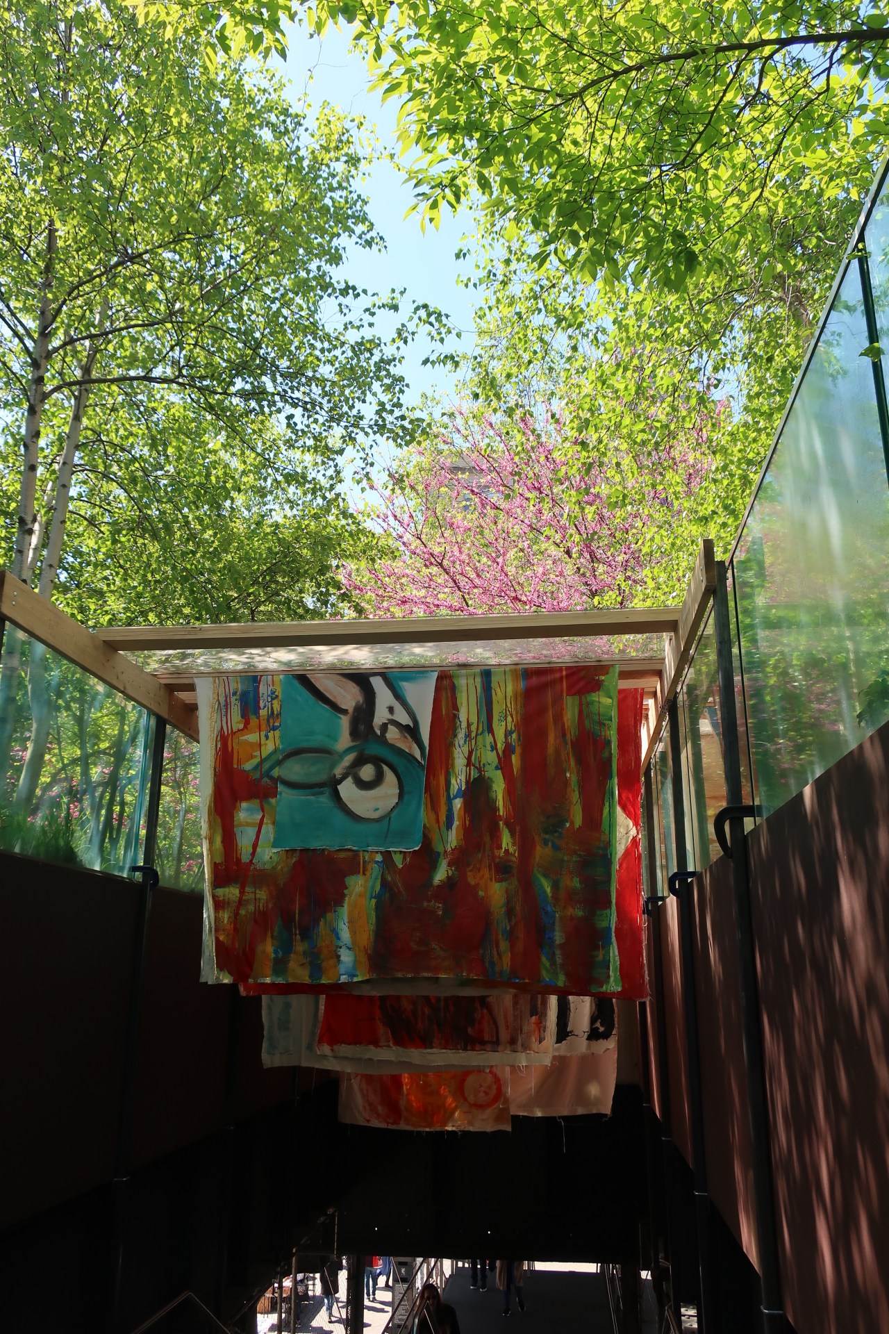 Et puis quand on approche du musée Whitney, on aperçoit dans les escaliers qui descendent pour rejoindre la rue en contre-bas, des drapeaux flottant au vent qui représentent des œuvres abstraites dans les rouges comme j’aime. Cela contraste avec les feuilles vert pomme et les arbres de Judée mauve.