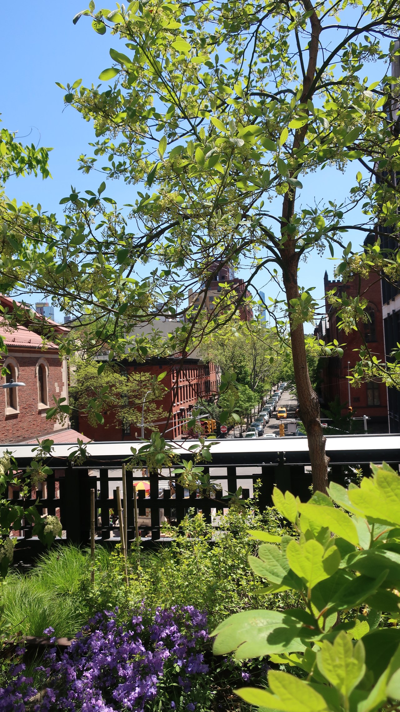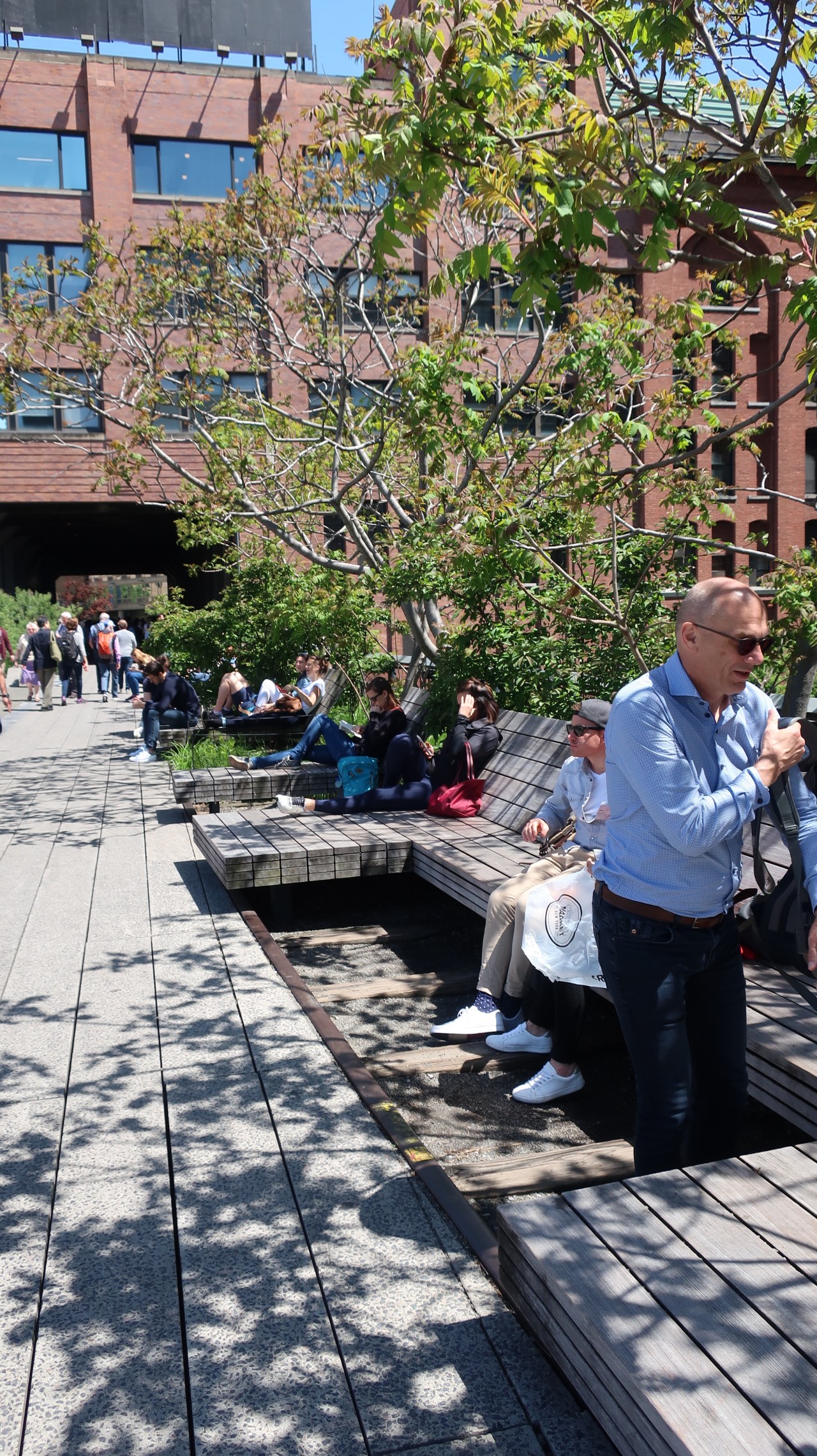 Mais repartons dans l’autre sens et tournons le dos au musée. On marche le long de la High Line et on remonte vers le nord. Là on peut s’asseoir où l’on veut sur des bancs en bois, spécialement installés pour les touristes ou les New-Yorkais, pour profiter du soleil et de la vue, faire bronzette ou tout simplement se reposer. Les arbres sont là pour faire de l’ombre, en particulier en été où la chaleur est accablante. Et puis la verdure est la bienvenue tout le long de ce chemin qui traverse NY.