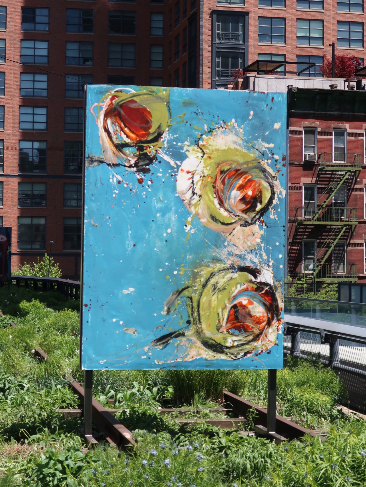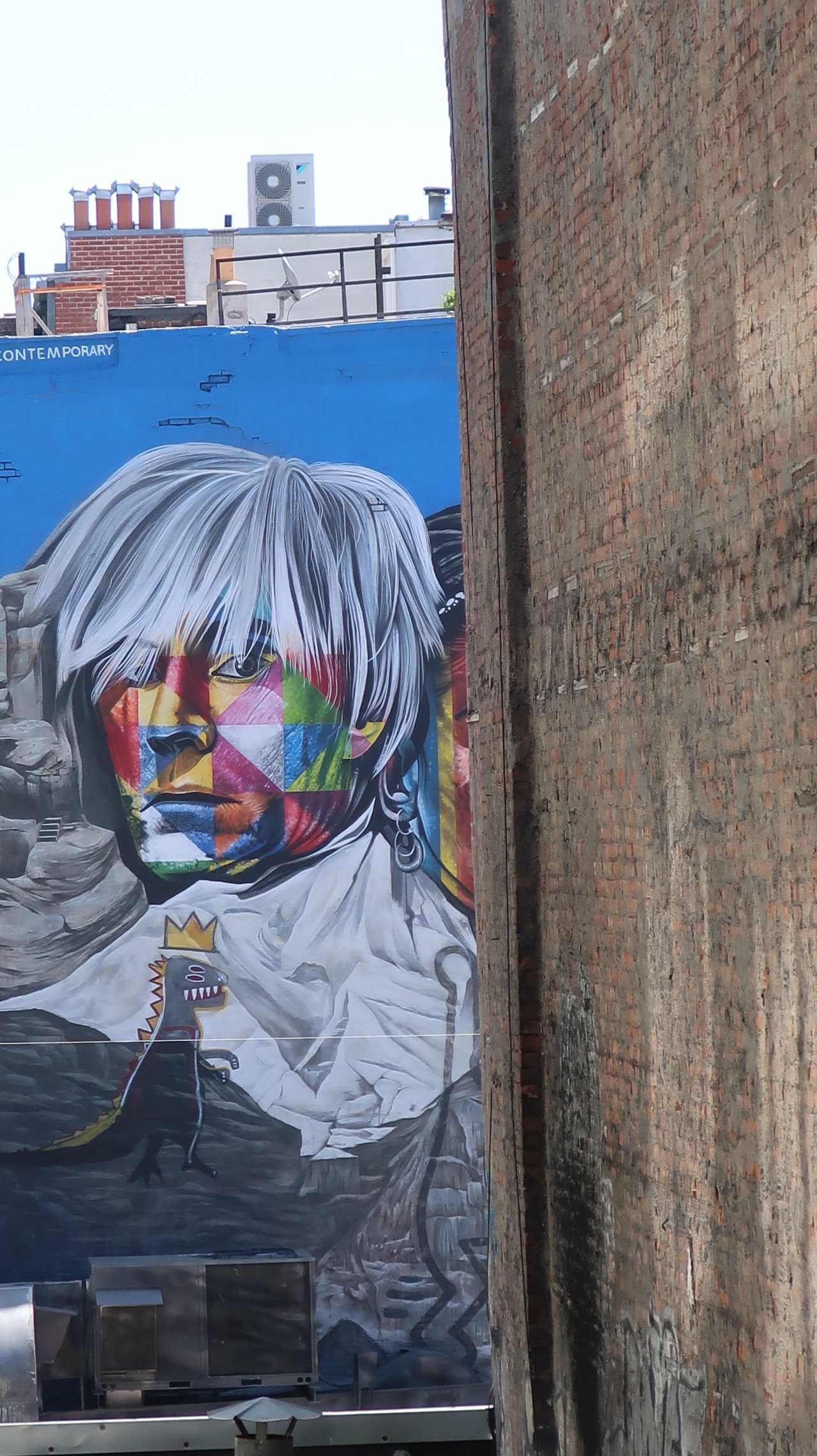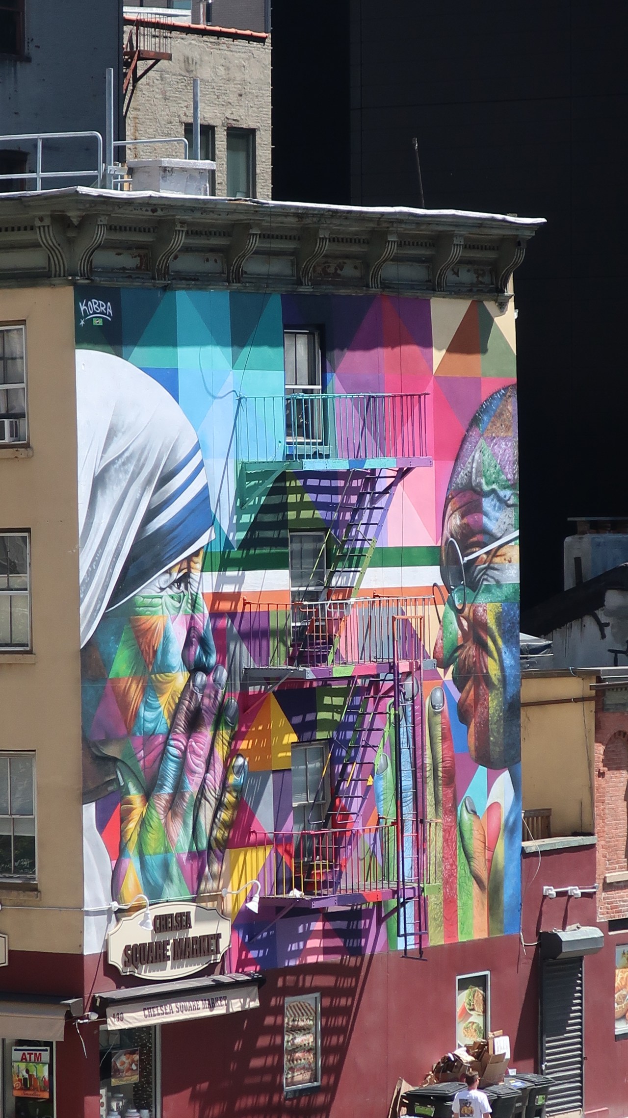 De la High Line on traverse et passe au-dessus de grandes artères et on peut admirer du street-art comme le mur recouvert des portraits de Mère Theresa et de Gandhi les deux apôtres de la paix, de la non-violence et de la bienveillance envers les hommes. Les couleurs du dessin dans les roses et mauve attrapent le regard et retiennent notre souffle.