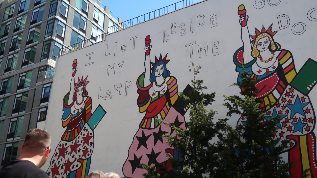 Puis l’ouverture fait à nouveau surface, on fait face à des complexes immobiliers tous plus impromptus les uns que les autres. Ils ont des formes rocambolesques : pointus avec une avancée triangulaire en forme d’aéropage avec une antenne en diagonale comme une queue d’hélicoptère ! D’autres ont des formes déjantées – on dirait que le bâtiment danse et se courbe. Un mur nous rappelle que nous sommes à New-York city avec la statue de la liberté stylisée en différentes tenues avec des étoiles marquant surement les nombreux états composant les Etats-Unis. Avec le slogan « I lift my lamp beside the Golden door ». Je vous laisse découvrir l’explication de l’artiste.