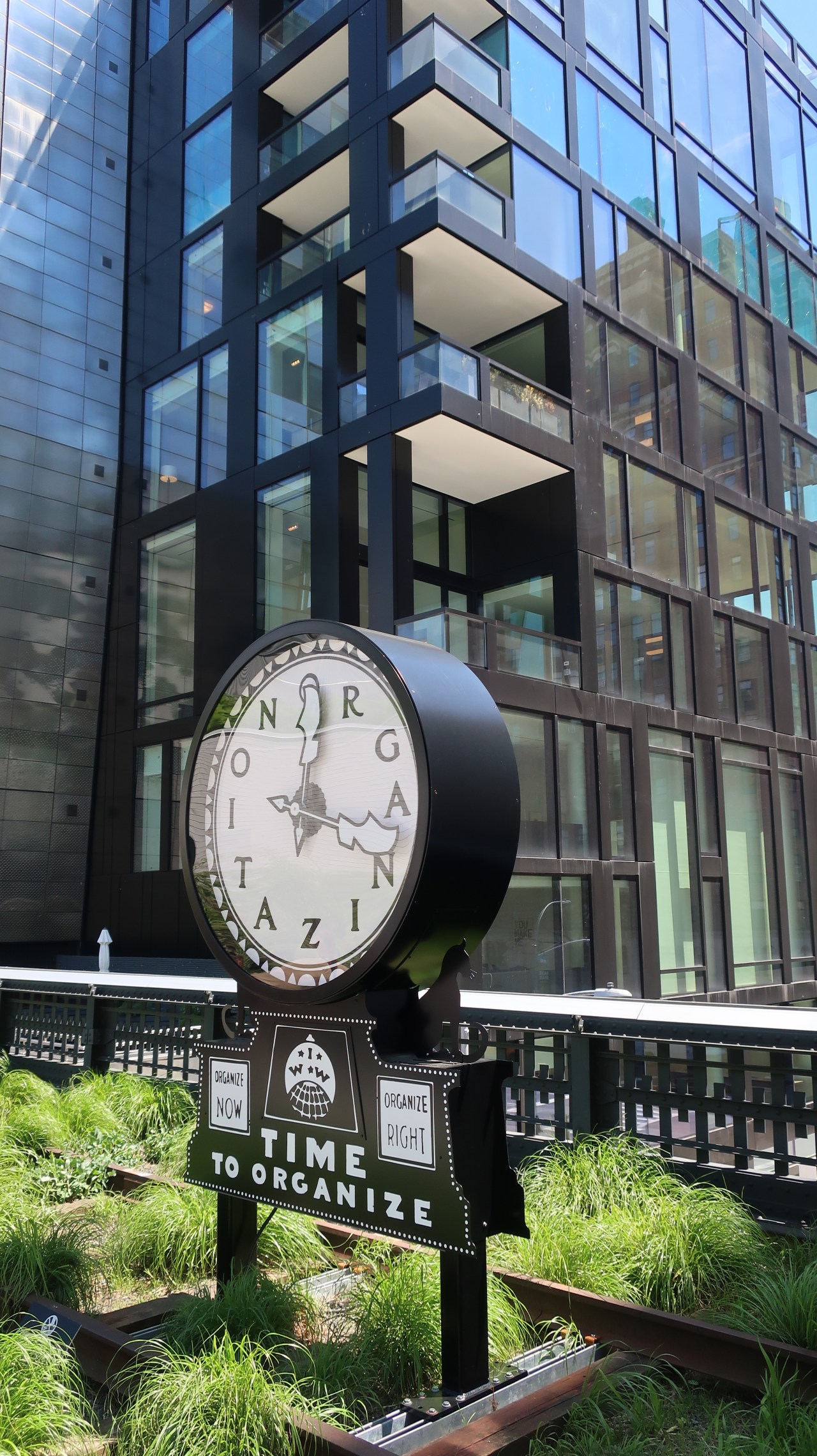 On passe devant une horloge qui marque 12h15 (heure à laquelle j’ai dû passer) où l’on peut lire en suivant les aiguilles d’une montre « organization » et vous intime l’ordre « Time to organize » ! Il est vrai que NY est le lieu favori de « time is money » ! Au cas où nous l’aurions oublié.