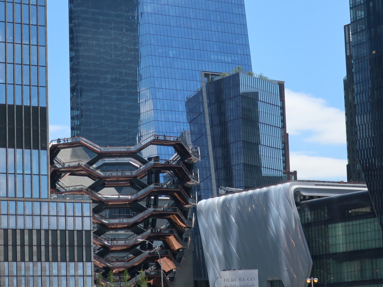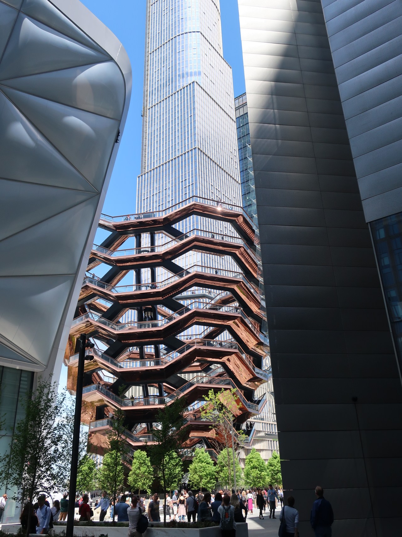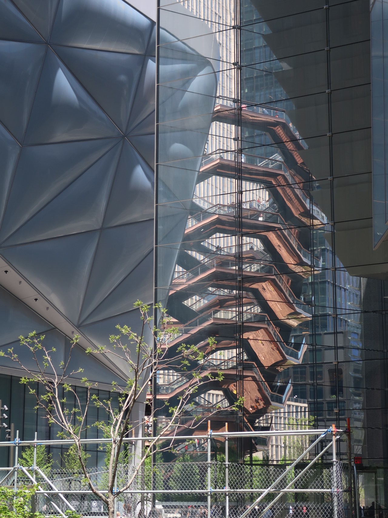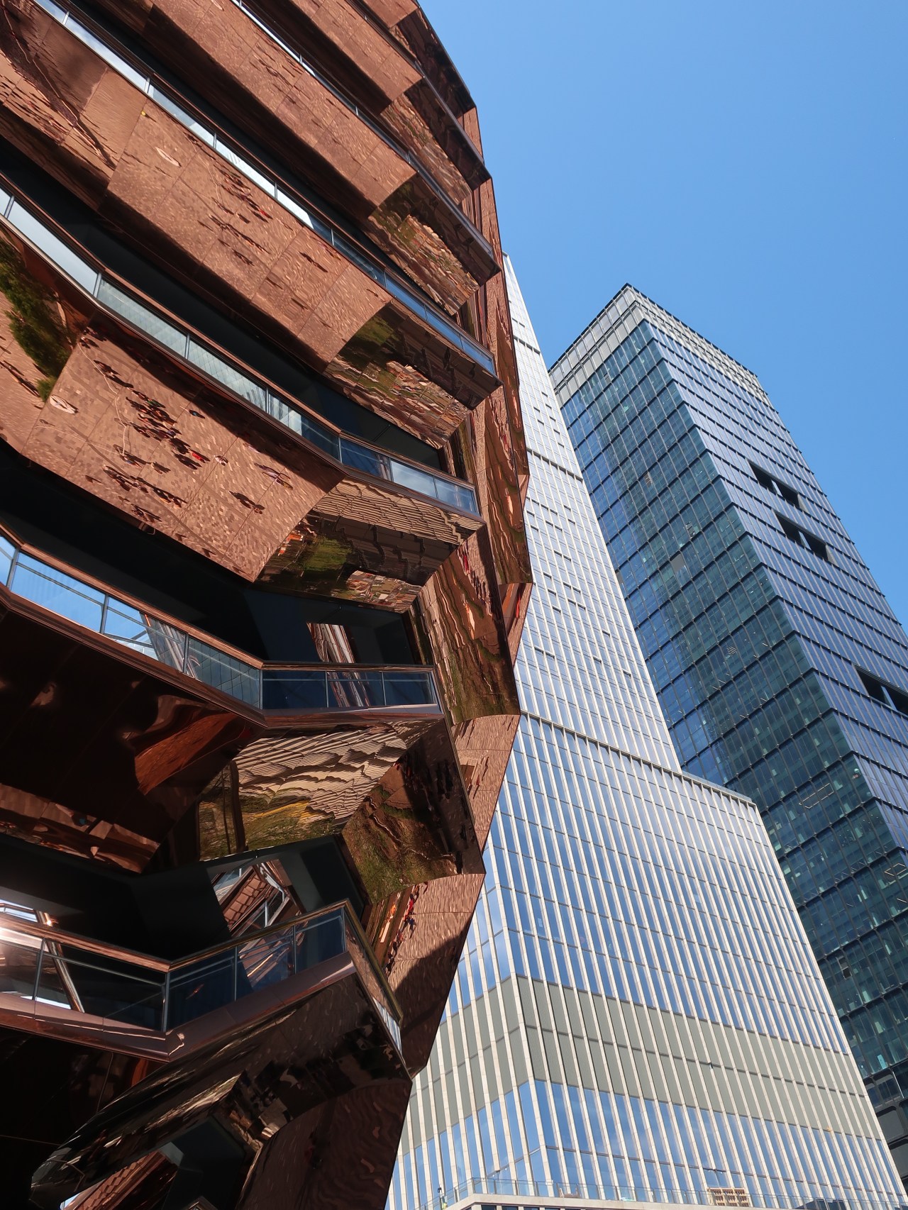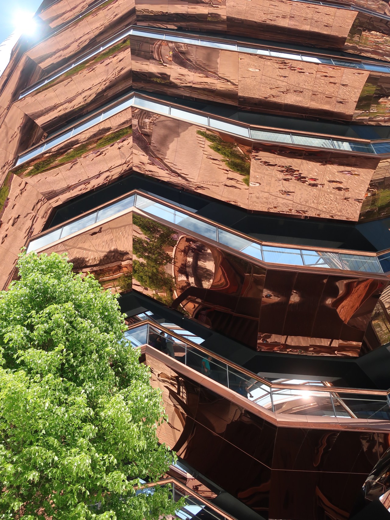 Et la High Line s’incline vers la gauche puis vers la droite pour atteindre le centre commercial Hudson et surtout le nouveau Vessel. Avant de tomber dessus on traverse une forêt d’immeubles de verre, inclinés, hexagonaux qui se rapprochent dangereusement et donnent l’impression de se toucher. Vues de l’esprit ! Et dans un espace limité le Vessel apparait comme le Trésor à Petra. Et là on le voit monter, descendre car il bouge ! Il se balance et on a l’impression qu’il plonge sur l’esplanade. Toute la modernité et la créativité de NY se font jour ici aussi. Ce bâtiment en cuivre avec ces ascenseurs et ces escaliers donne le tournis ! J’ai passé un sacré moment à le regarder sur l’esplanade du centre commercial. Il brille, se reflète et reflète les mouvements de la foule. Il monte, il descend, s’écarte ou rétrécit. Vision de l’esprit et des yeux ou bien tout simplement mouvement imprimé par le bâtiment ? Je l’ai trouvé incroyable à cet endroit, entre les gratte-ciels et les arbres si frêles qu’il semble les étouffer et les avaler. Et les hommes et les femmes montent les escaliers ou bien prennent les ascenseurs ou escalators. Jeu de miroir se reflétant dans le cuivre et le soleil.