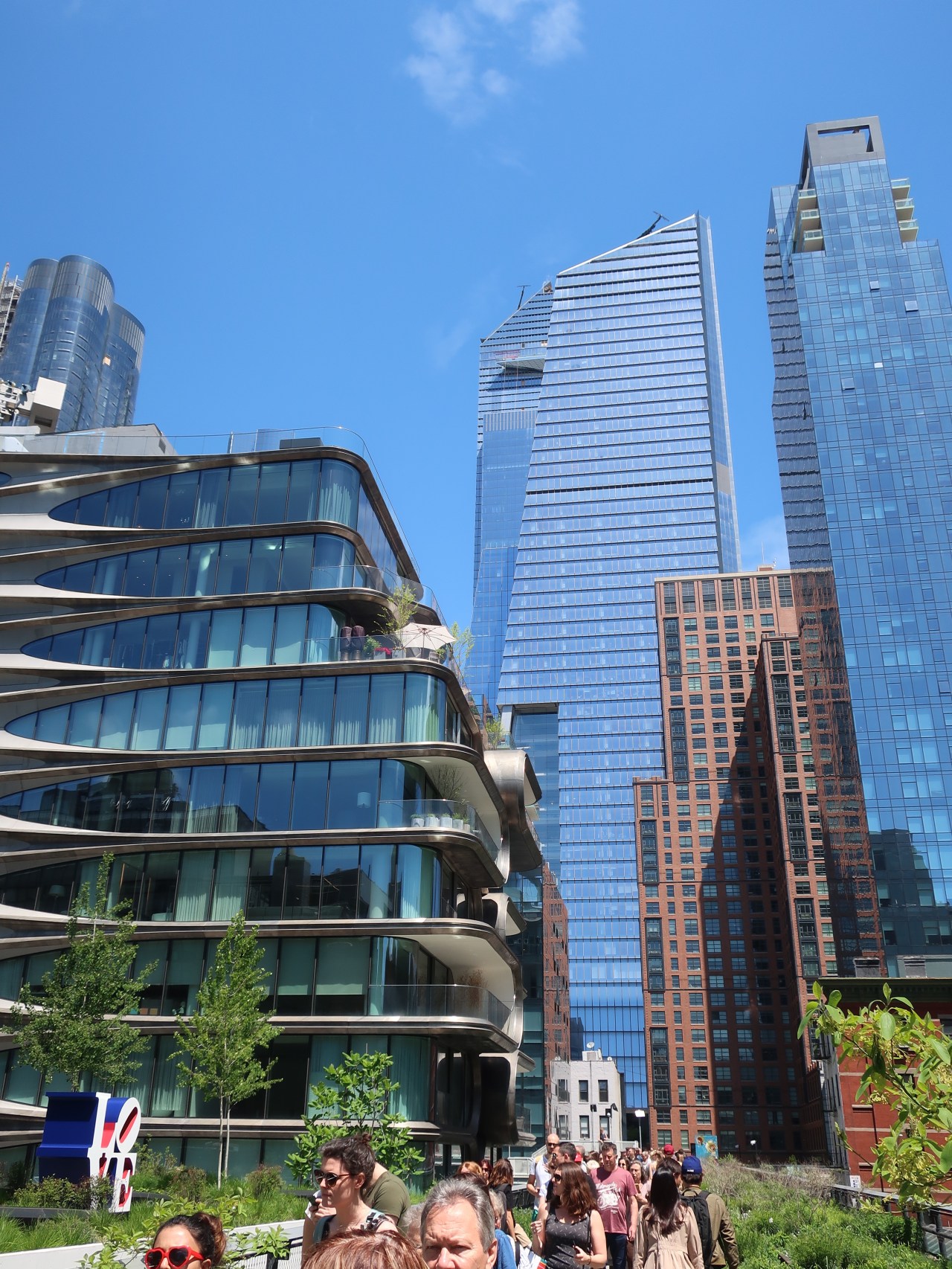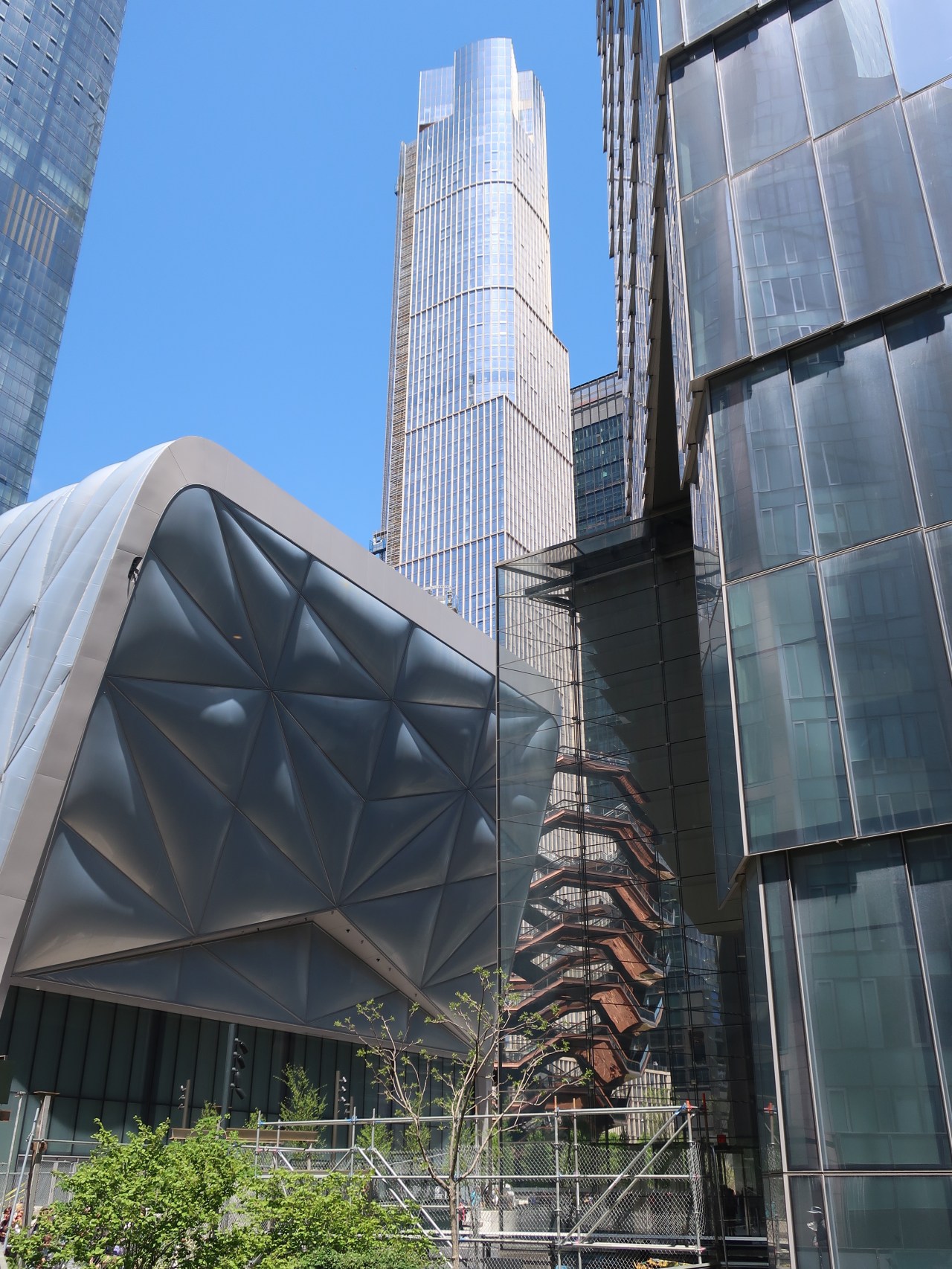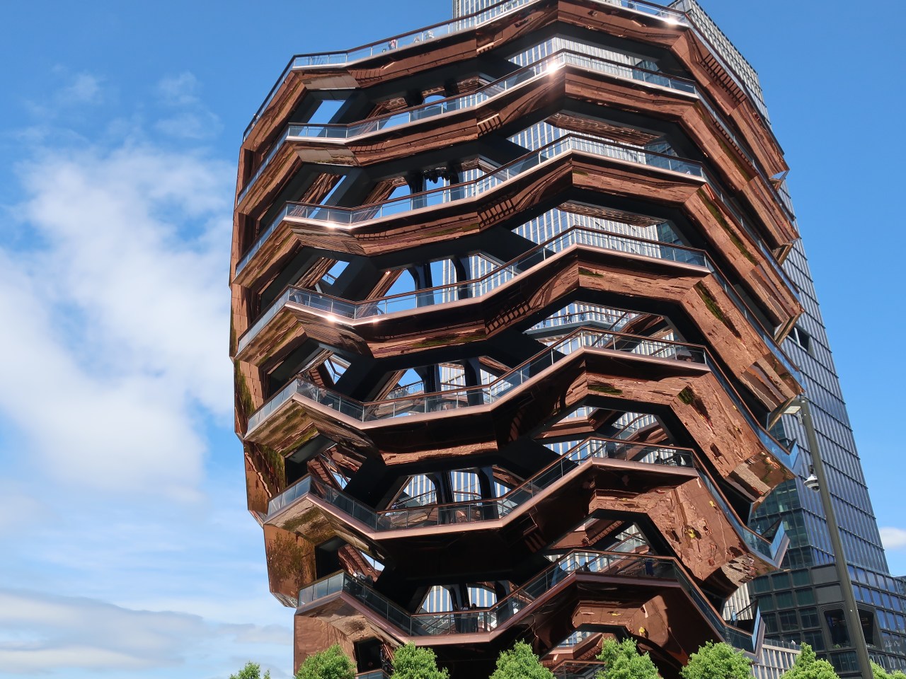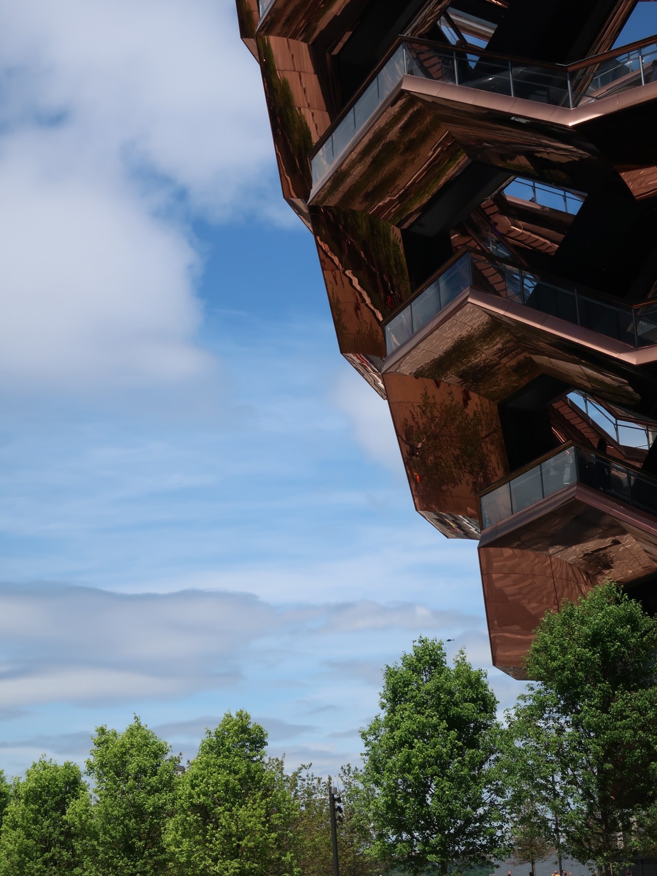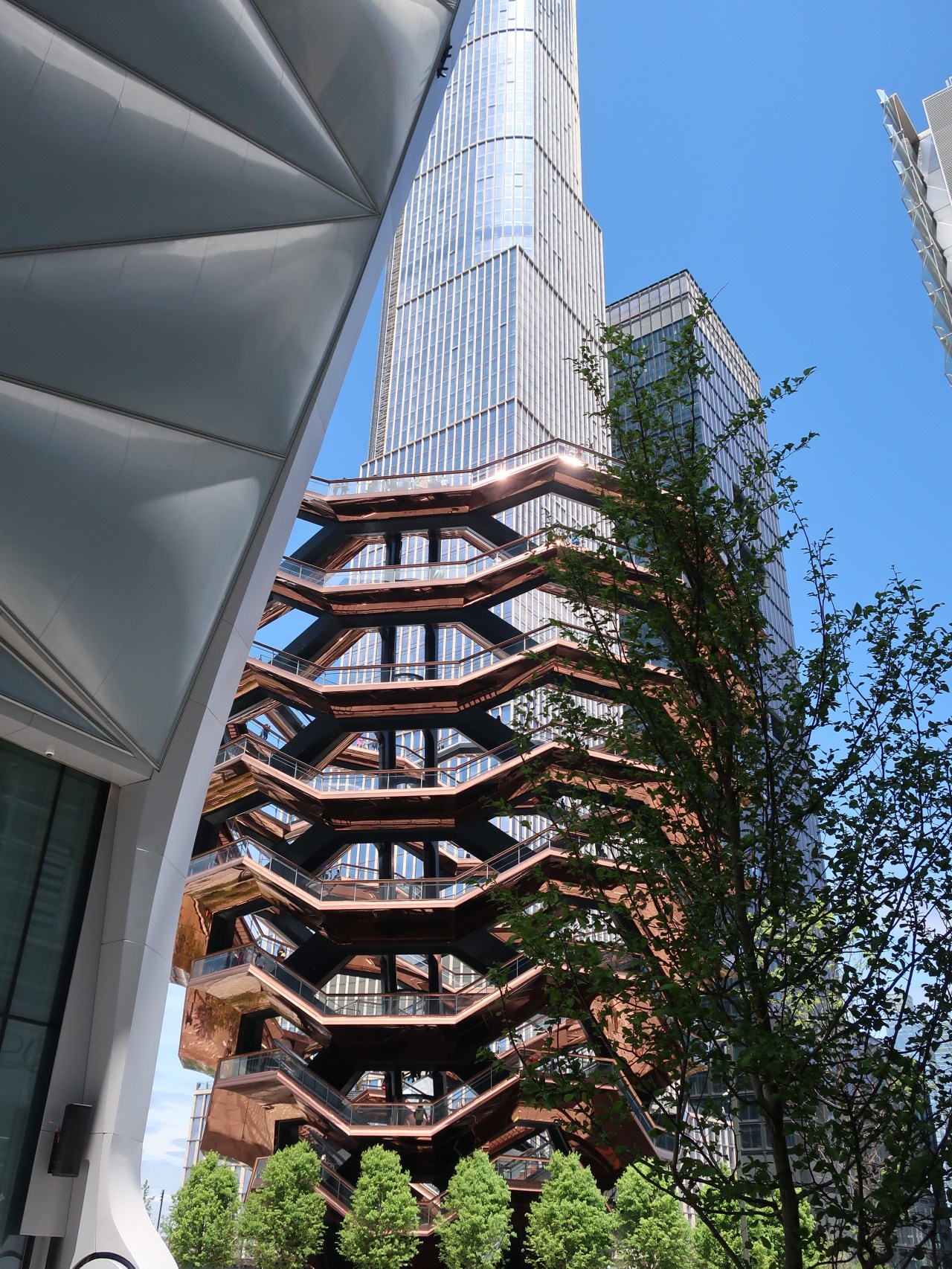 Et la High Line s’incline vers la gauche puis vers la droite pour atteindre le centre commercial Hudson et surtout le nouveau Vessel. Avant de tomber dessus on traverse une forêt d’immeubles de verre, inclinés, hexagonaux qui se rapprochent dangereusement et donnent l’impression de se toucher. Vues de l’esprit ! Et dans un espace limité le Vessel apparait comme le Trésor à Petra. Et là on le voit monter, descendre car il bouge ! Il se balance et on a l’impression qu’il plonge sur l’esplanade. Toute la modernité et la créativité de NY se font jour ici aussi. Ce bâtiment en cuivre avec ces ascenseurs et ces escaliers donne le tournis ! J’ai passé un sacré moment à le regarder sur l’esplanade du centre commercial. Il brille, se reflète et reflète les mouvements de la foule. Il monte, il descend, s’écarte ou rétrécit. Vision de l’esprit et des yeux ou bien tout simplement mouvement imprimé par le bâtiment ? Je l’ai trouvé incroyable à cet endroit, entre les gratte-ciels et les arbres si frêles qu’il semble les étouffer et les avaler. Et les hommes et les femmes montent les escaliers ou bien prennent les ascenseurs ou escalators. Jeu de miroir se reflétant dans le cuivre et le soleil.
