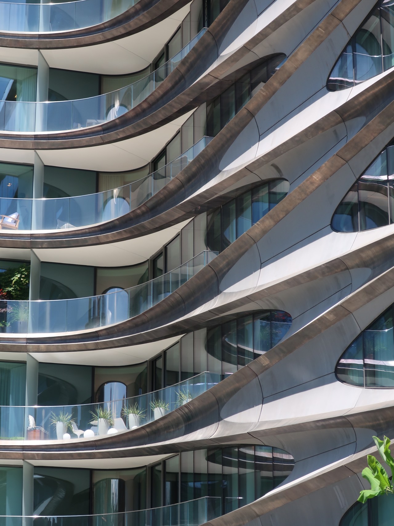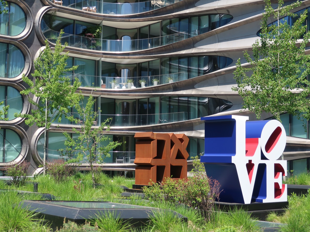 On peut même regarder l’empire state building avec ses jolis arcs avant la pointe si fine. Et on entre dans la partie où les immeubles sont tous différents et sortent de nulle part ailleurs. L’enchantement devant nos yeux ! Immeubles en étages comme des espaliers dont les vitres transparentes nous donnent la possibilité d’admirer les intérieurs quand ce ne sont pas les balcons ! Les tours carrées qui finissent en pointe, toutes plus hautes les unes que les autres ! C’est juste impressionnant et miroitant ! ça donne le tournis ! Et puis en bas de ces immeubles on voit une statue « Amor » puis « Love ». On relève le nez et on dirait des vagues dans l’architecture de l’immeuble. Captivant ! D’autres appartements font comme des U en forme horizontale avec des balcons en verre. Un autre monde nous entoure fait de verre et d’acier, mélange de notre époque et de temps « art modern ».