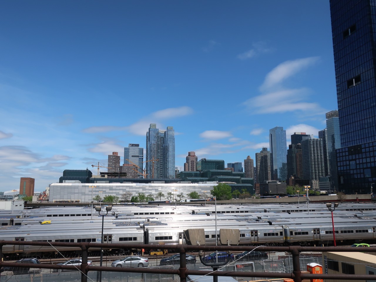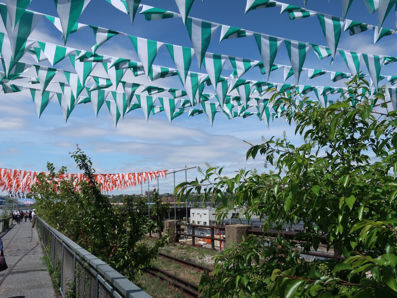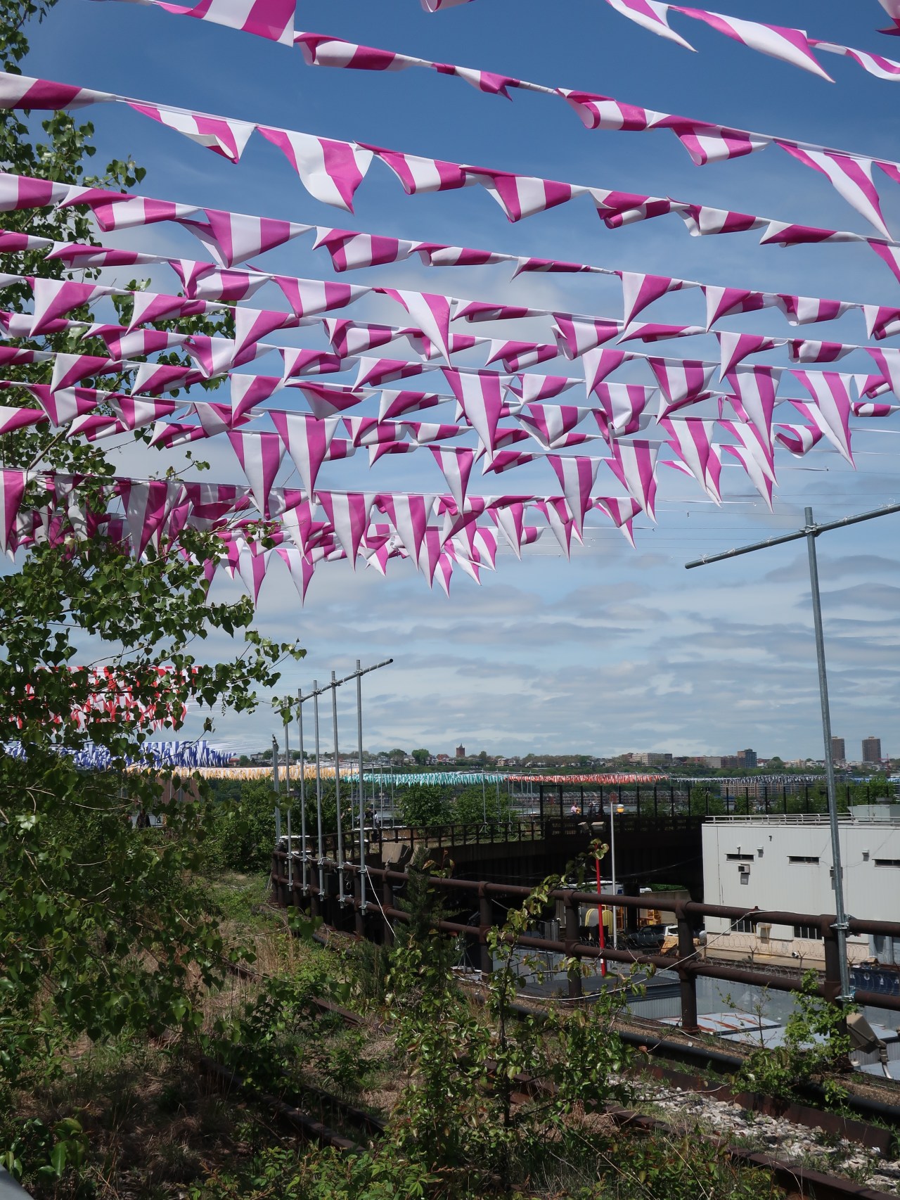 Et puis j’ai repris le chemin vers les voies de chemins de fer CXS transportation rail yards. Sorte de garage des rames de métro se succédant les unes parallèles aux autres, rangées en files indiennes qui miroitaient, se reflétaient les unes dans les autres et brillaient sous le soleil de plomb qui créait une réverbération. Et là un air de fête, comme dans les bals populaires, se faisait avec les fanions de toutes les couleurs qui volaient au vent. Là la route est moins belle, ouverte au ciel plombé de chaleur et longeant une grande artère, donnant une vue sur l’Hudson river à couper le souffle.