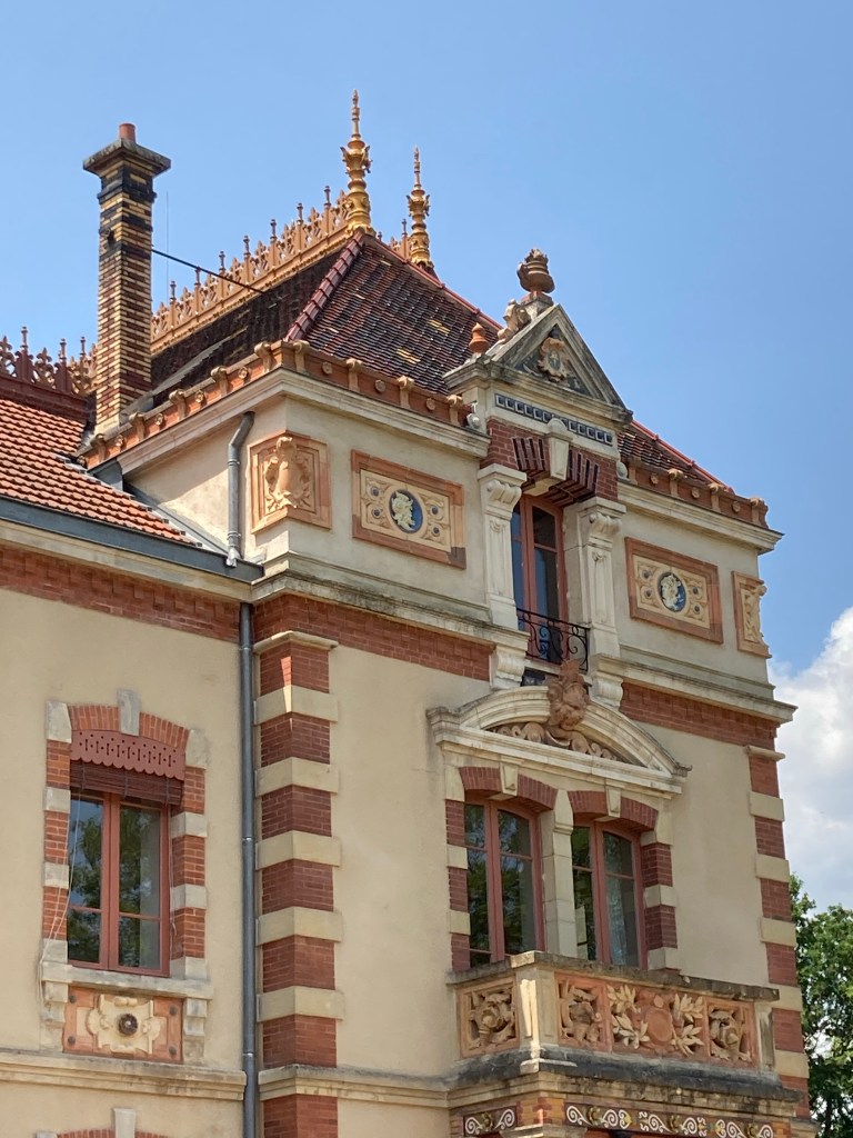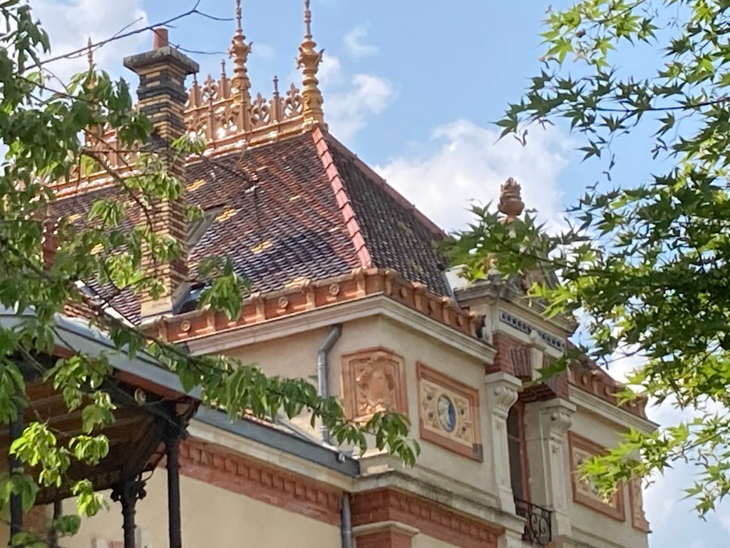 C’est parti pour la métamorphose de la villa : briques, tuiles méconiques, tuiles plates, émaillées, mitres de cheminées, frises, médaillons, faïences murales…