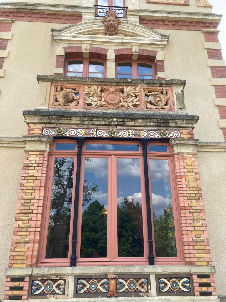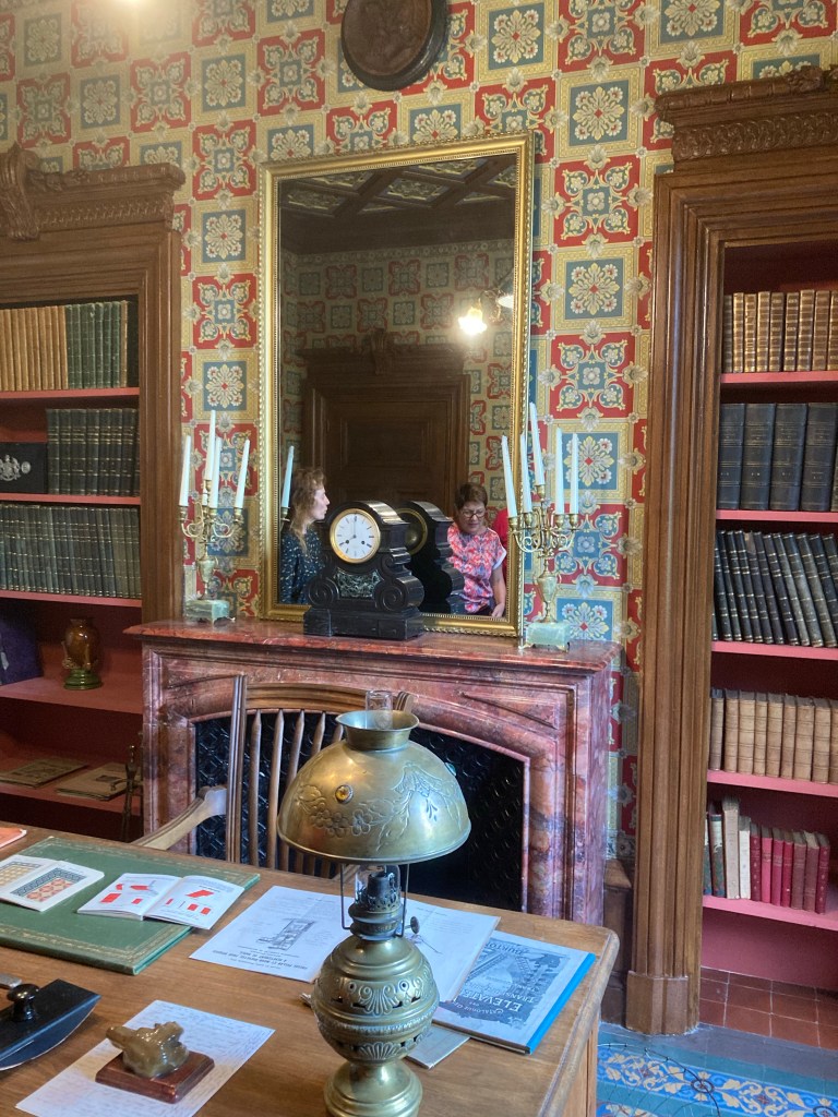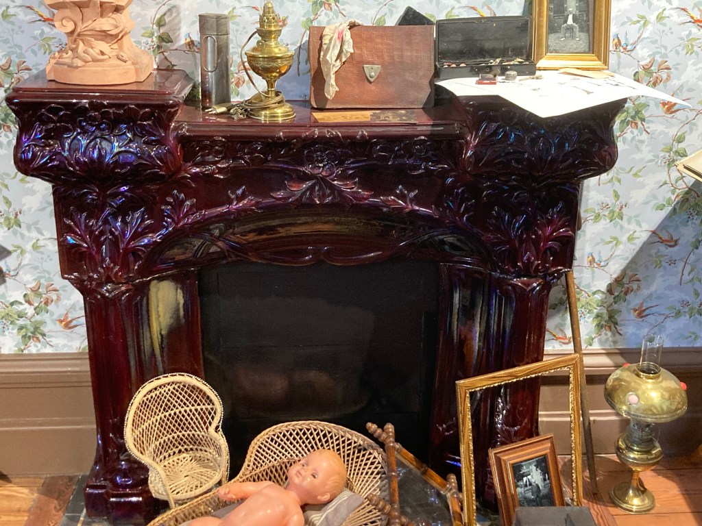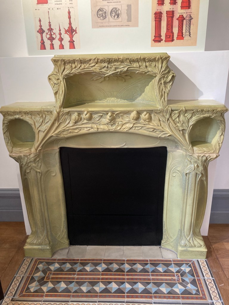 On monte au dernier étage et on commence par visiter les lieux où de très belles cheminées – trois rescapées et faites-en céramique. Le sol est recouvert de carreaux de céramique Perrusson. C’est une galerie des créations Perrusson.
