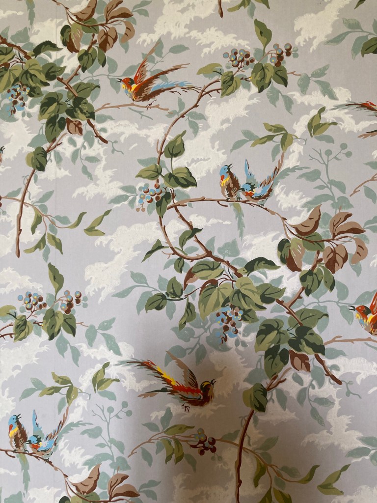 Le papier peint est fait d’oiseaux et a été reconstitué par des spécialistes du papier peint à tampon situé dans la région.