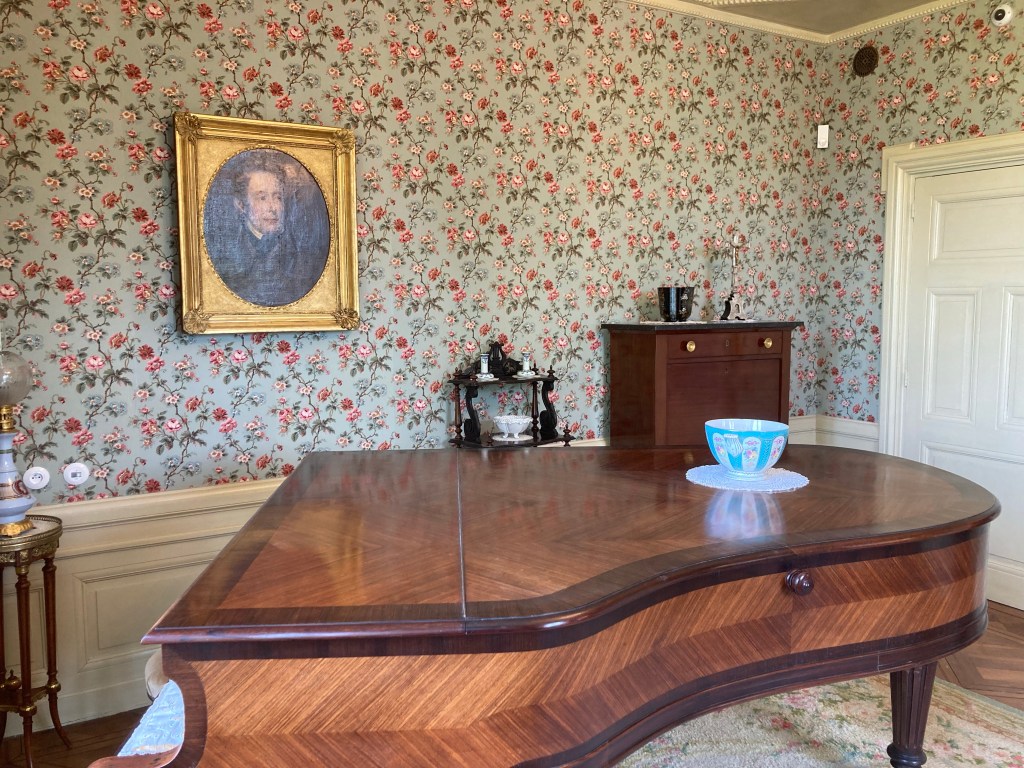 Puis nous découvrons les pièces à vivre comme le salon avec le piano et des meubles Louis XV. Tous ces meubles sont prêtés par l’Etat.