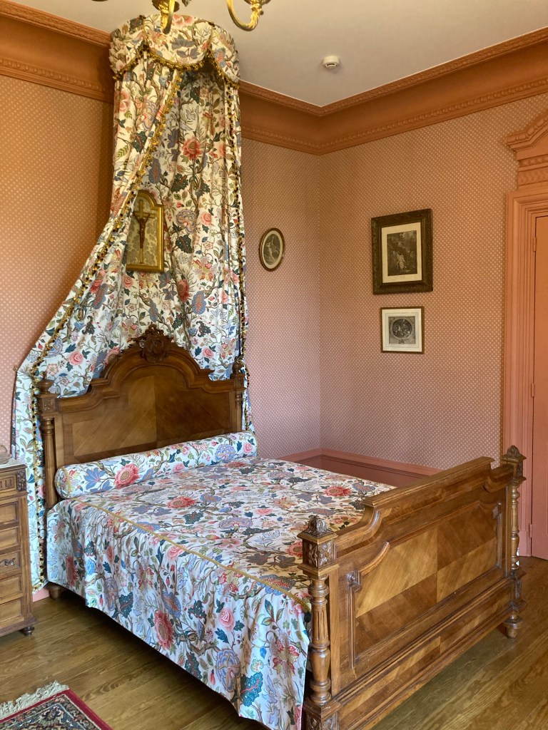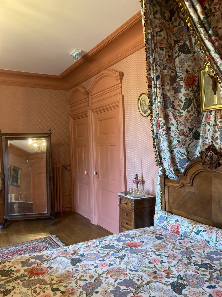 On admire aussi la chambre de Madame dont la porte ne peut fermer à clef alors que celle de Monsieur a un verrou. Les tons sont dans les roses brique avec un lit à deux places pour les besoins du couple. Chacun faisant chambre à part.