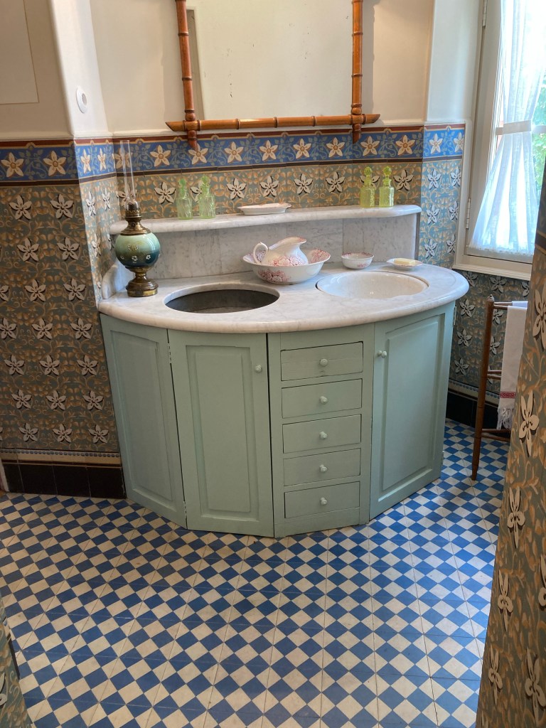 Les deux chambres sont séparées par le cabinet toilette où l’on peut se laver. Les femmes de chambre montent des seaux d’eau chaude, les versent dans le lavabo, qui lui-même une fois sa toilette faite, peut se vider en faisant une rotation et l’eau s’écoule dans un pot de chambre en dessous. Moderne, non ?