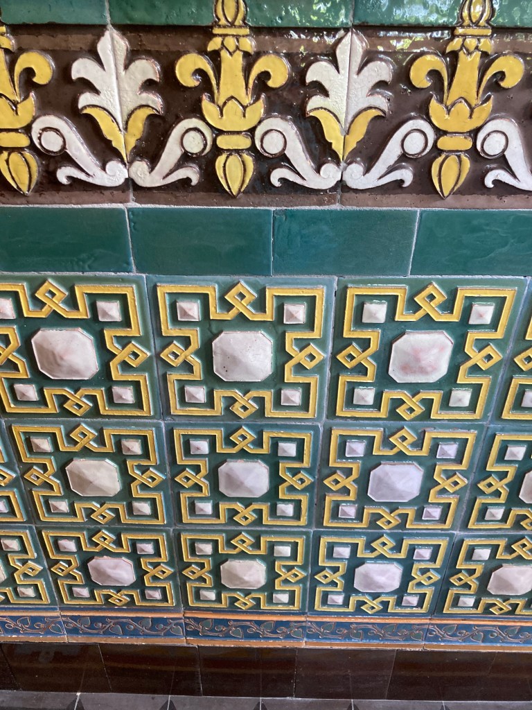 Plafond avec des céramiques faites de fleurs bleues et de feuillages beige ; des fleurs rouges ; des dessins chinois ou turques et les sols regorgent de céramiques avec des dessins les plus extraordinaires.