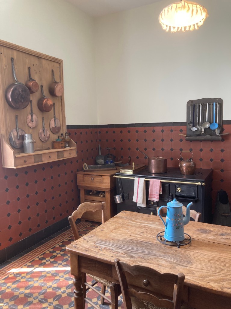 Et derrière la porte un couloir où un passe-plat permettait à la cuisinière d’apporter les plats chauds. La cuisine étant un peu plus loin. Là les carreaux étaient beaucoup plus simples, en couleurs rouge et noirs comme on en voit encore aujourd’hui.