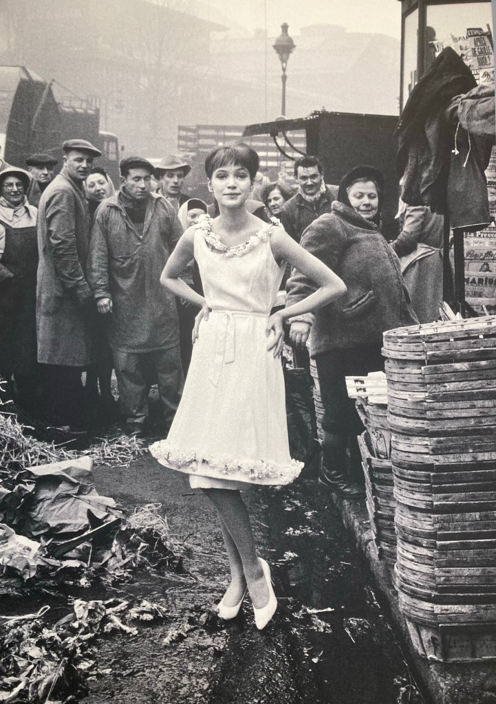 Mon premier regard s’est porté sur cette femme en blanc comme une mariée ou une vierge qui pose aux halles, dans le ventre de Paris. La beauté de cette immaculée, la saleté des alentours et la tristesse des marchands de quatre saisons dans un froid polaire est un hymne au bonheur. (Anna Karina aux halles). Elle porte une robe de Coco Chanel.
