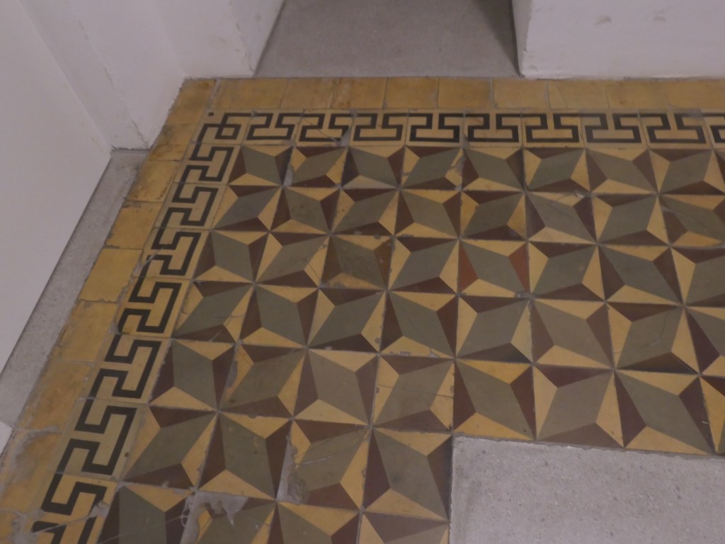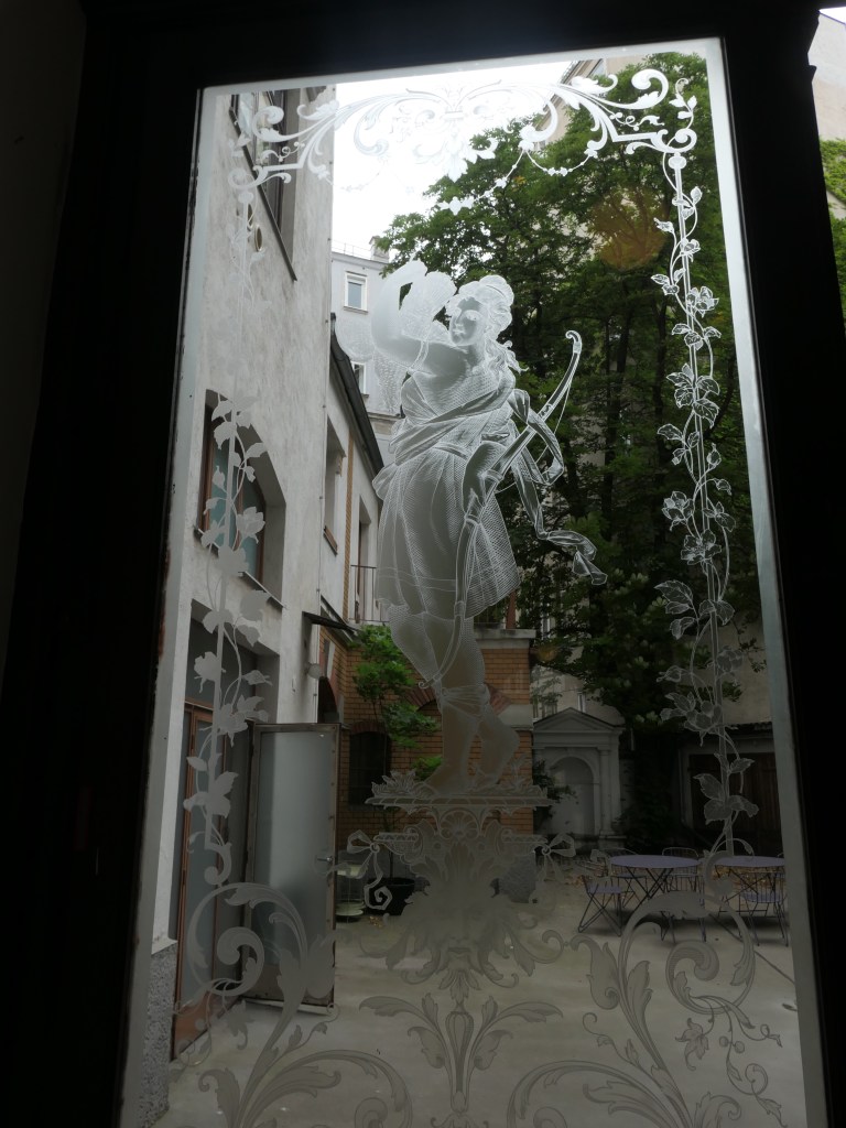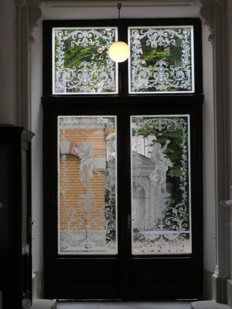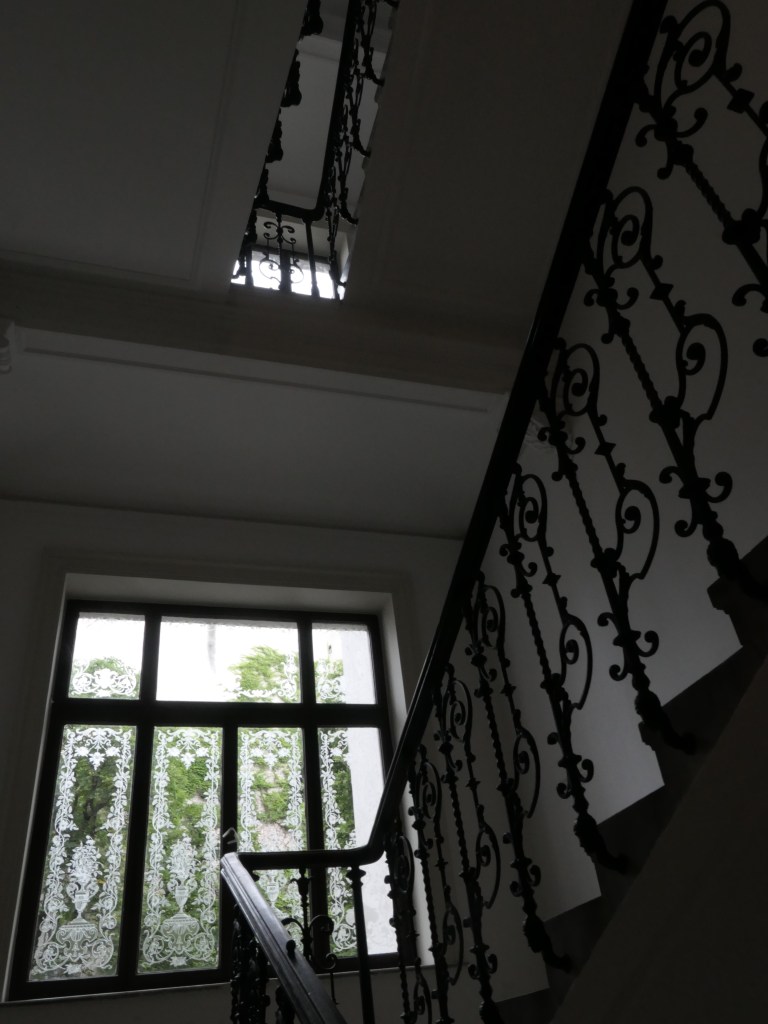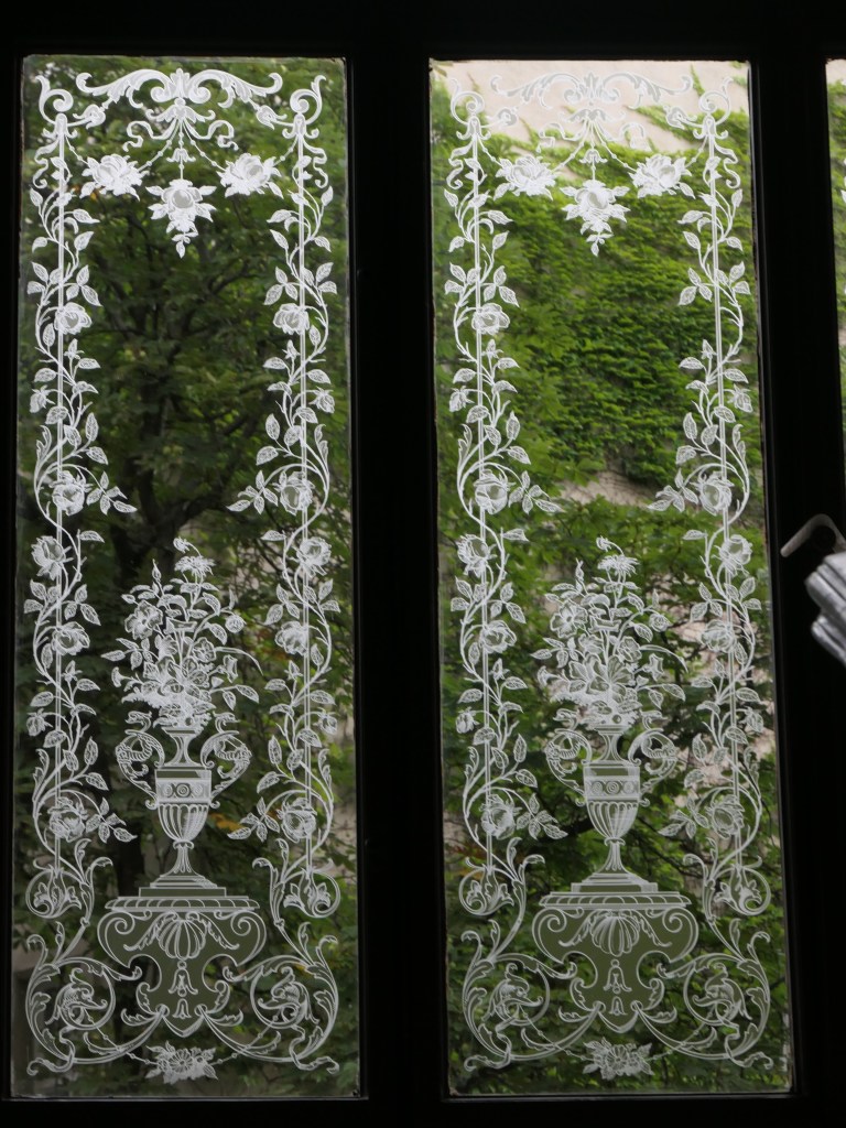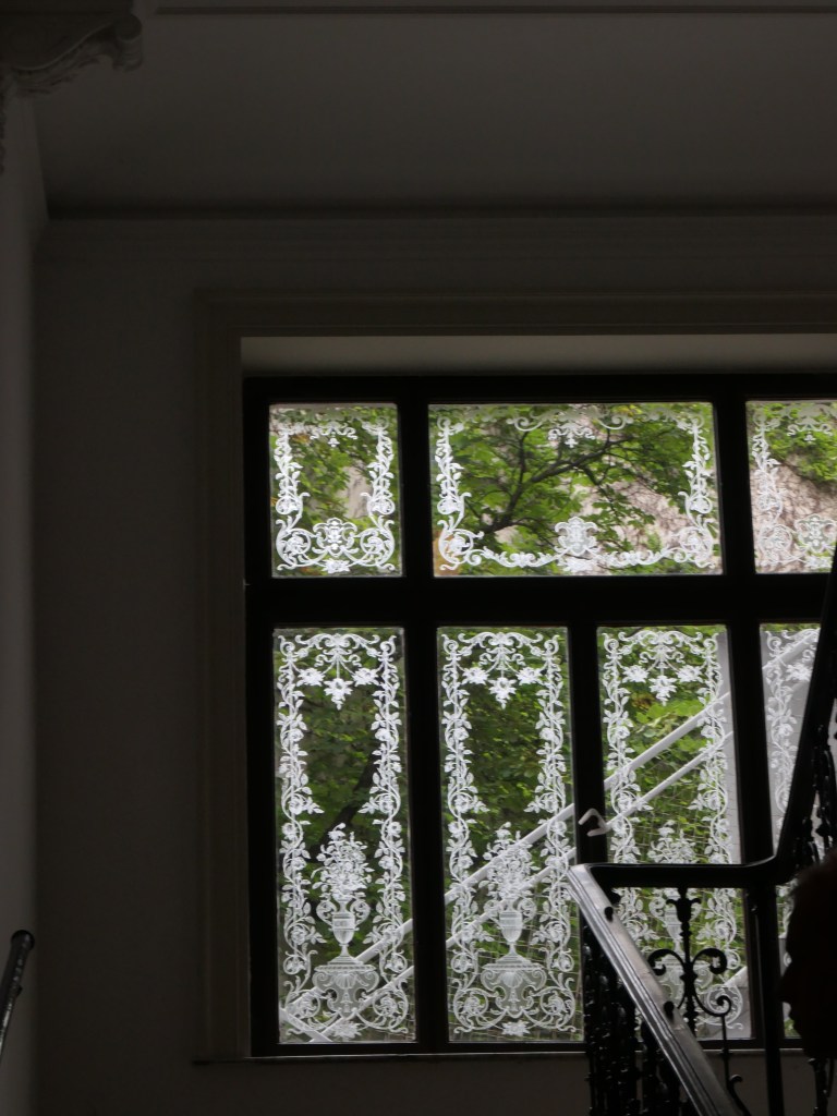 On arrive au deuxième étage par un escalier magnifique dont les rampes sont travaillées. Les vitres qui donnent sur le jardin sont les reflets de femmes sérigraphiées avec des rubans de fleurs tout autour. C’est juste magnifique. D’autres vitres se confondent dans les arbres du jardin et le vert des feuillages s’intègre à merveille dans les vases et les rubans de fleurs. On peut aussi tout en haut des escaliers, admirer les carrelages dignes des Perrusson en Bourgogne.