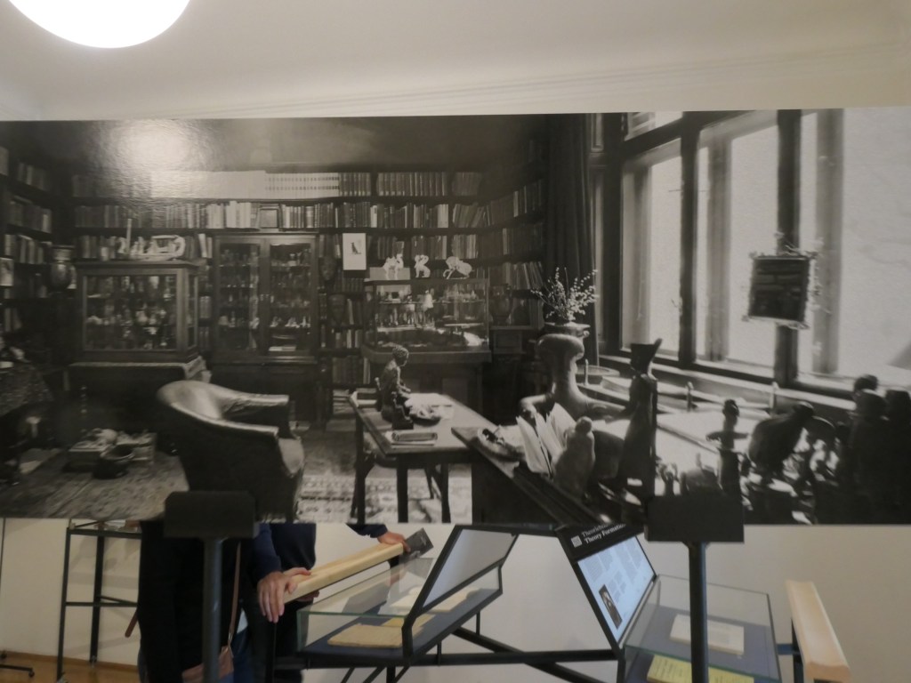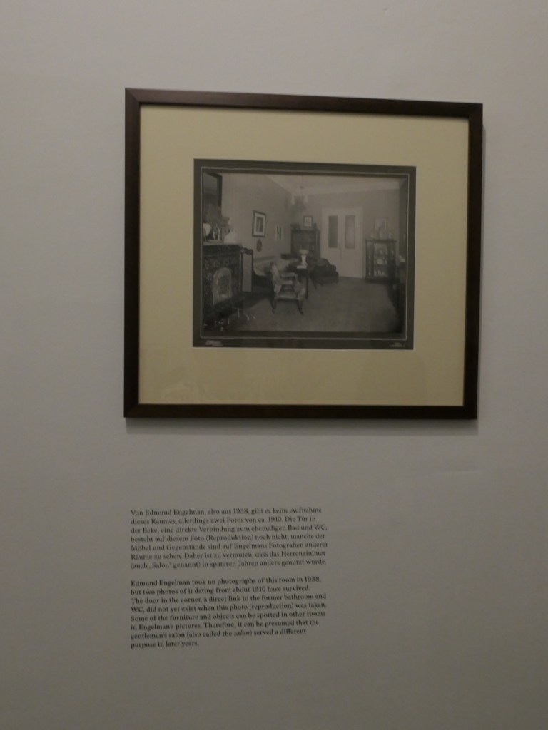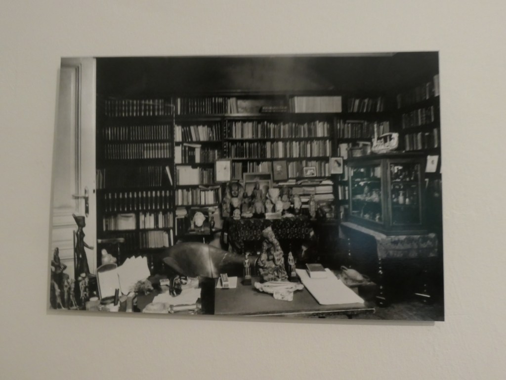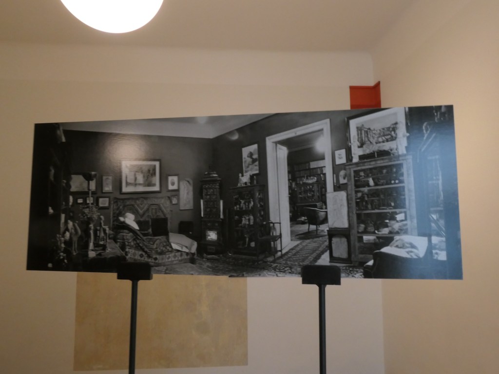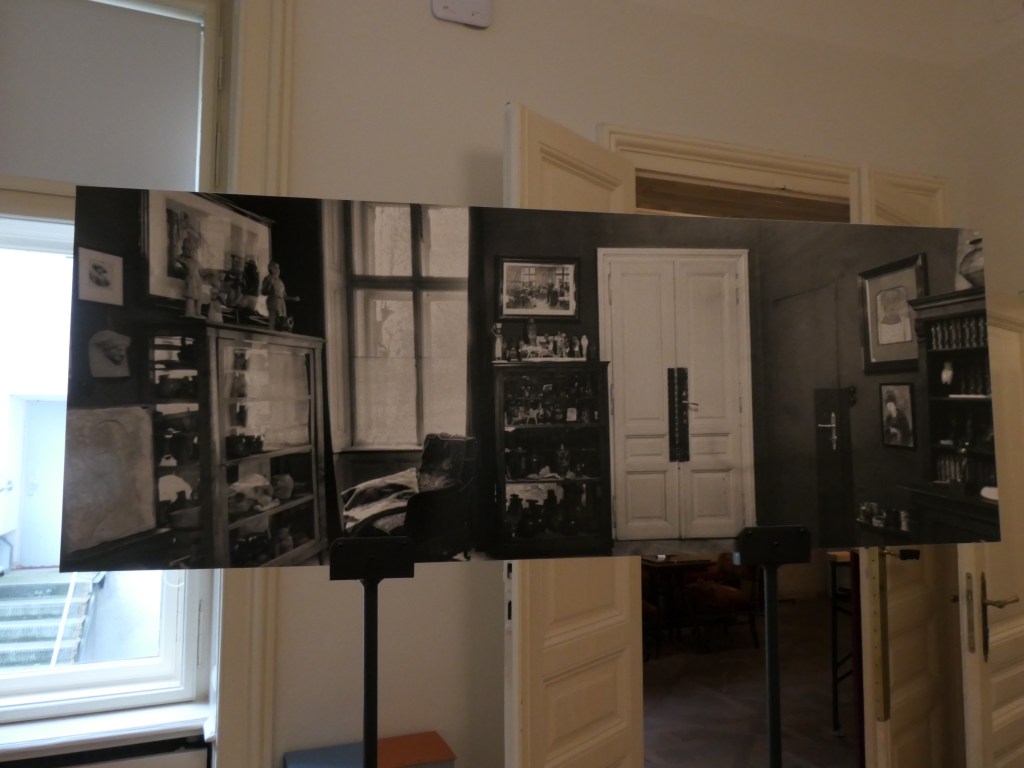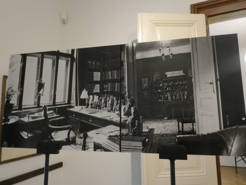 On peut passer d’un appartement à un autre par un petit corridor ou bien par le pallier. Et là on entre dans la salle d’attente au sofa rouge du bureau de Sigmund Freud. On est très touché de découvrir cet endroit intact. Puis on entre dans son bureau où de grandes photos en noir et blanc nous donnent la perspective complète du lieu avec tous les objets et meubles le constituant. Impression de partager un moment de vie de Sigmund Freud. On découvre le mur de livres qui alimentait ses réflexions et son travail, les vitrines avec des objets gréco-romains ou bien égyptiens car Freud collectionnaient ces objets. On peut voir encore quelques exemplaires qui ont survécus à la guerre et aux déménagements.