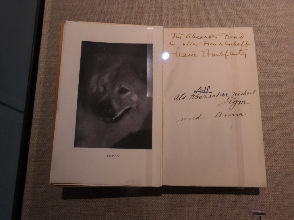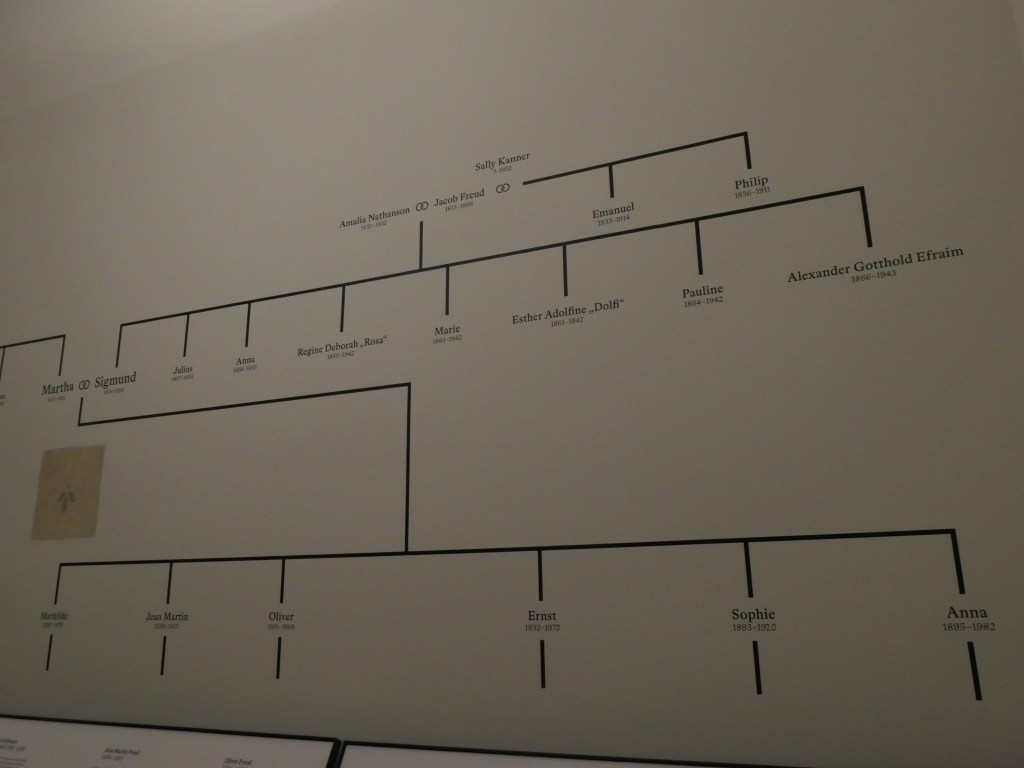 J’ai choisi de démarrer par le lieu familial (porte de gauche) où l’on passe d’une chambre à une autre pour dérouler l’appartement en entier. On y trouve les chambres des enfants, la salle à manger qui a été changé en lieu de réflexion sur la psychanalyse. Et on découvre dans chaque pièce des objets ayant appartenu à Freud, des photos, les livres qu’il a écrit avec ses collègues comme Charcot en France – premières éditions dans toutes les langues européennes, toutes ses lettres avec sa famille et ses collègues travaillant sur la psychanalyse. On peut aussi y découvrir l’arbre généalogique de la famille Freud que je vous partage. Un livre a attiré mon attention – celui avec la photo d’un de ses chiens, un chowchow qu’il adorait, nommé Topsy. Toute sa vie il aura des chowchows. On y verra aussi l’annonce de sa mort dans le journal France Soir.