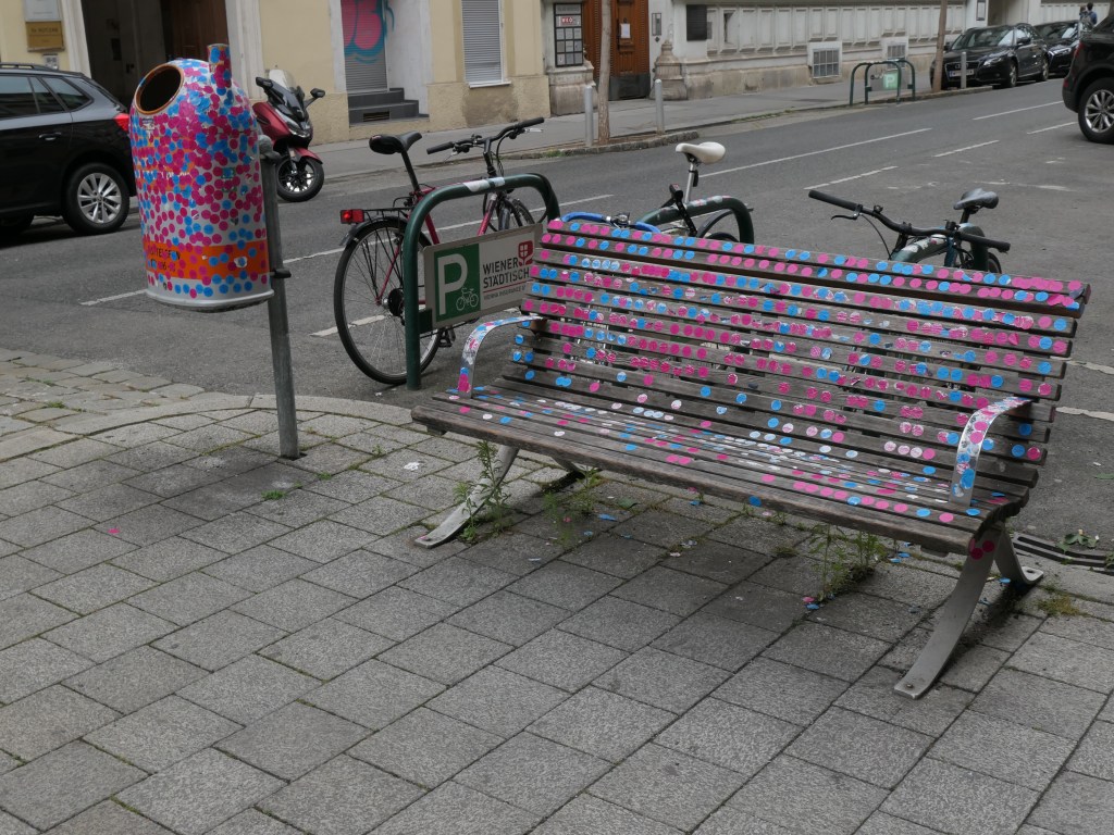 Le musée a été fondé en 1971, rénové et étendu en 2020. Il donne sur la rue Bergasse mais aussi sur une cour calme. L’immeuble est cossu, tout blanc et sans trop de fioritures. On peut admirer sur le vitrage de la porte Sigmund Freud Museum. Devant l’immeuble se trouve un banc coloré de pois bleus, mauves, blancs ainsi qu’une poubelle colorée de la même manière. Evocation des rêves ?