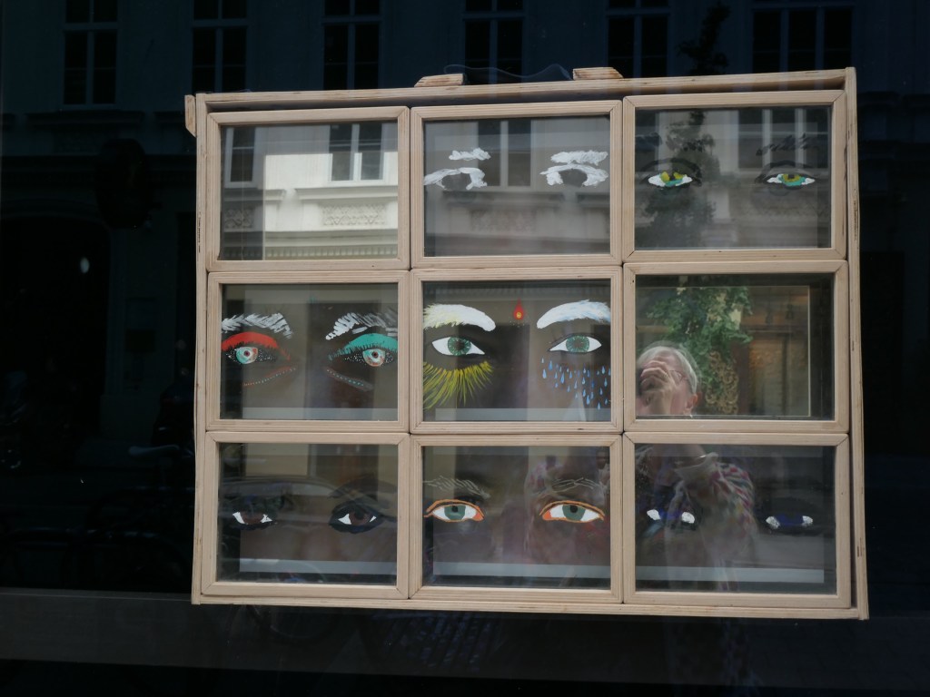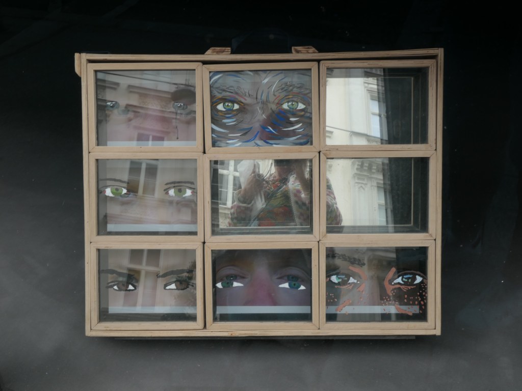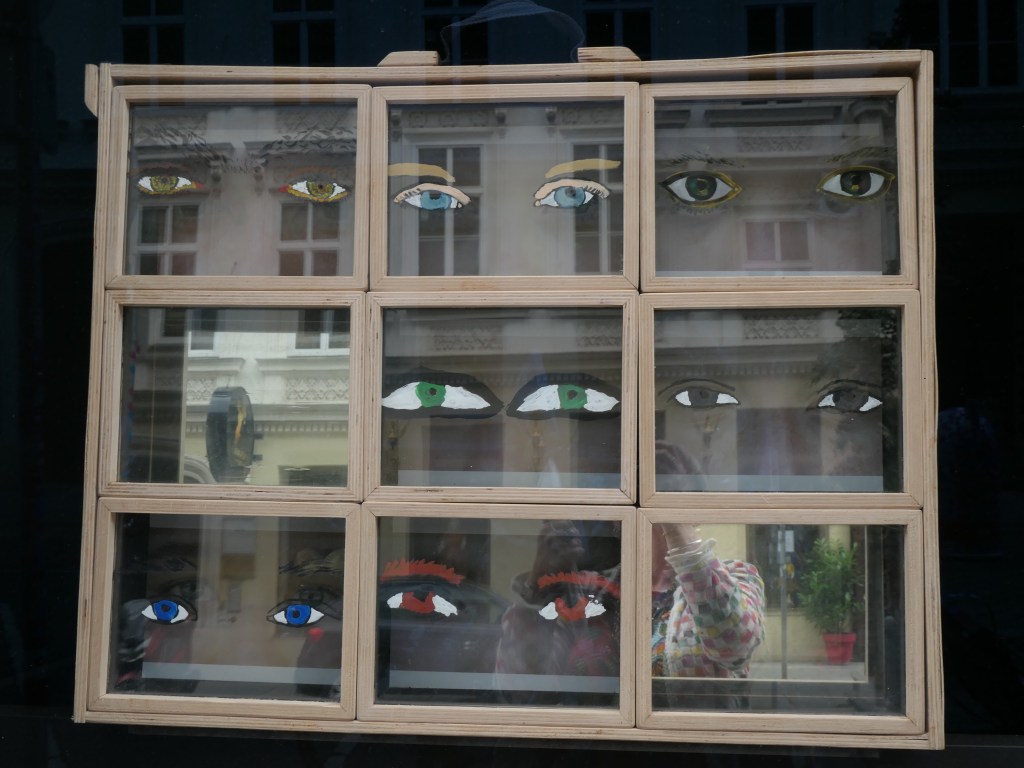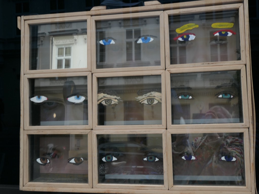 En ressortant de l’immeuble on peut voir dans une vitrine attenante toute une série d’yeux (Eyes ou Ochi en Ukrainien) et cela m’a interpellé au point de les photographier. C’est une porte d’entrée sur l’âme. Cette exposition a été créé en 1916 dans une petite ville à côté de Lviv. Cela a permis à des enfants, après l’invasion du Donbass et de la Crimée de s’exprimer sur la perte psychologique des parents, sur l‘anxiété que la guerre peut transmettre à des enfants. Ceci a été réalisé pour les 40 ans de la mort d’Anna Freud qui s’était occupé des enfants traversant la seconde guerre mondiale. Ces yeux nous montrent la diversité des origines des hommes, des différences de couleurs d’iris et de formes et nous ouvrent au monde qui nous entoure.