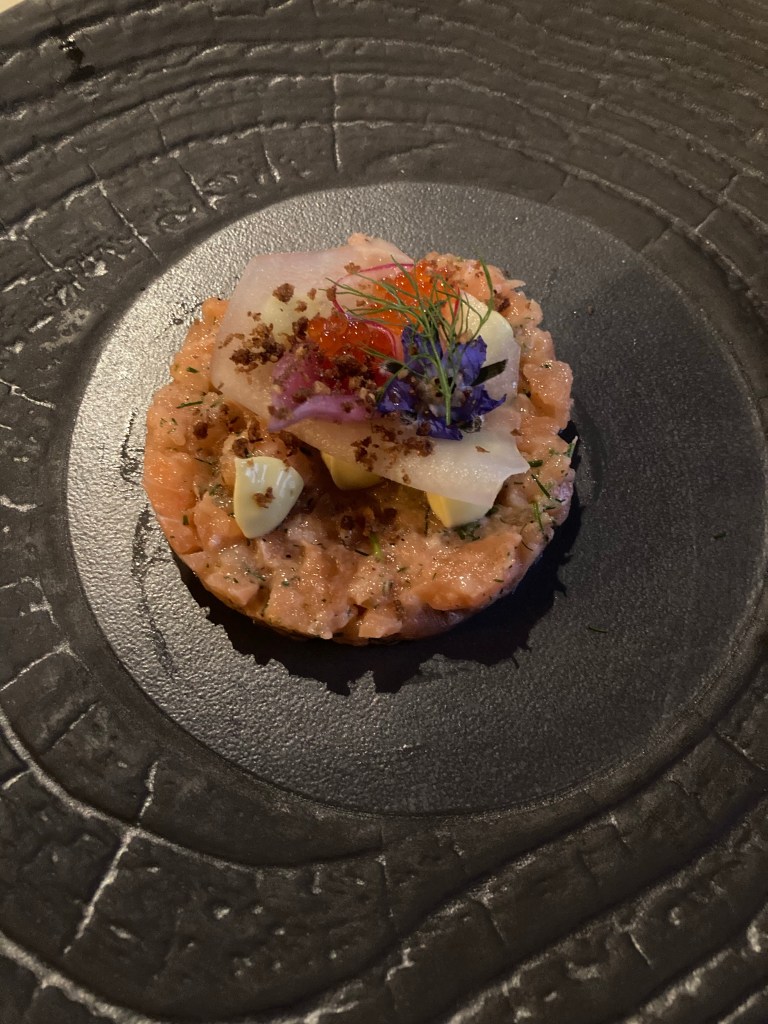 Du tartare de saumon frais avec des épices, aneth, caviar de saumon (pour nous œufs de saumon) joliment décoré de fleurs du cru. Car le saumon est élevé en fermes et exporté à travers le monde et surtout en Europe.