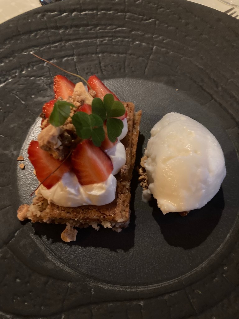 Des desserts à se damner comme celui à la fraise sur un à la pâte d’amandes et une glace à la vanille ; ou bien celui à Sorvagen fait d’une tarte avec des baies sauvages, des tomates et du fromage par-dessus. Ça fondait dans le palais. Ou bien ce dernier à la pomme. Il y a aussi beaucoup de cheese cake.