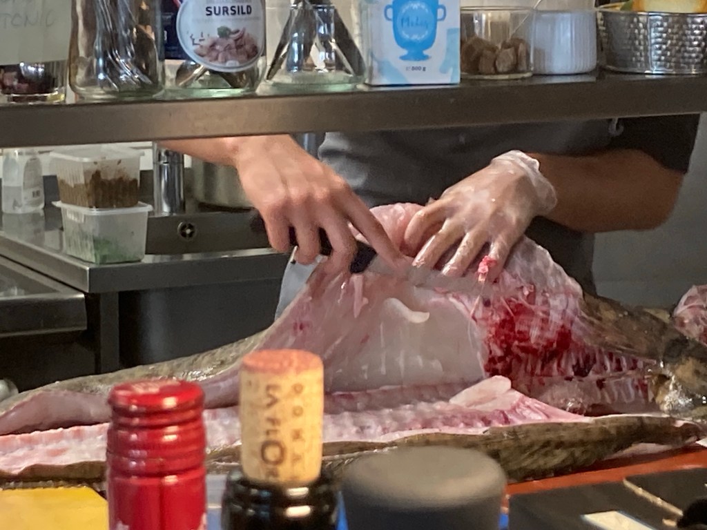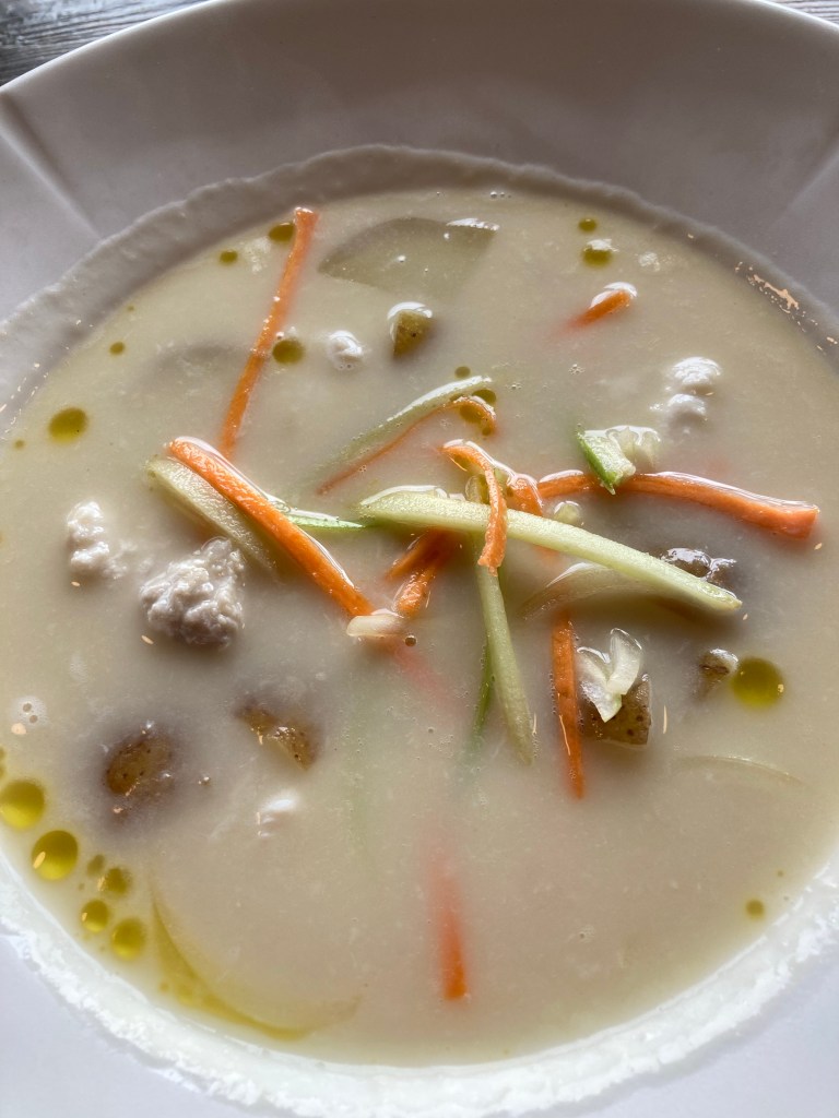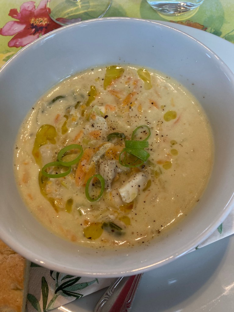 Soupe de poissons où on mélange morue, halibut, flétan et des légumes avec des pommes de terre, le tout accompagné d’une soupe de crème – très gouteux