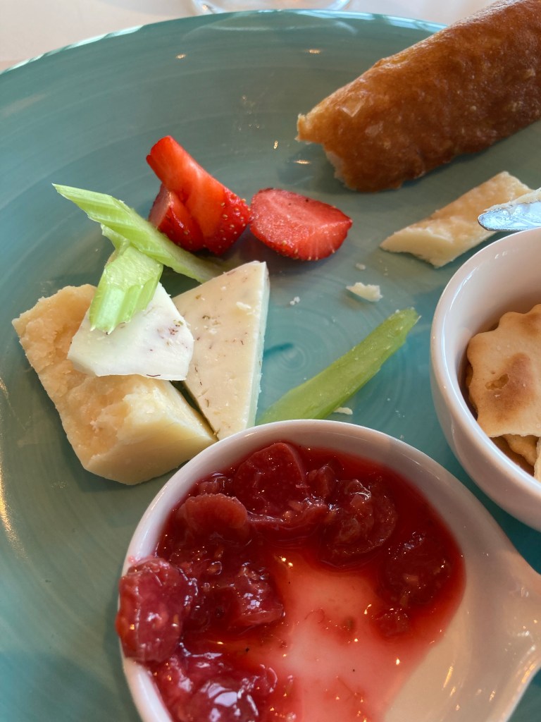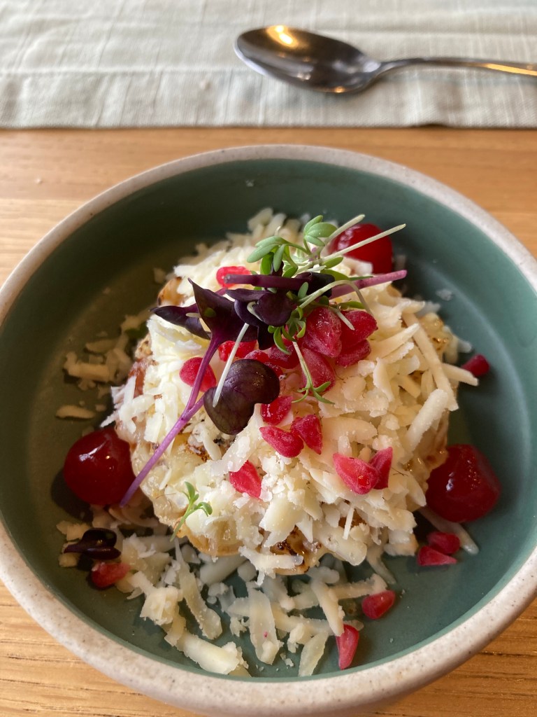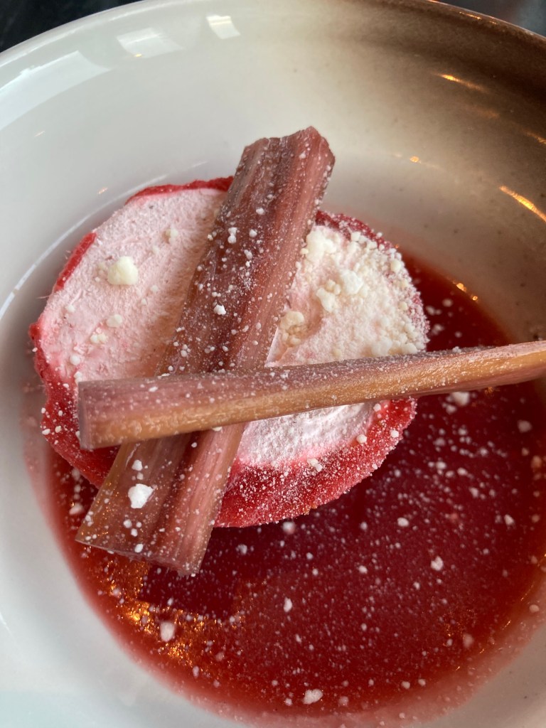 Les gaufres aussi au petit-déjeuner accompagné d’un cappuccino et de confiture ou bien de crème fraiche !Un parfait à la rhubarbe dans un coulis de rhubarbe – un peu déçue !