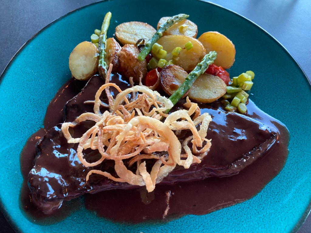 Un filet de baleine que j’ai moyennement apprécié car j’avais déjà un a-priori de manger de la baleine. Cela donne l‘impression de manger un steak de bœuf plus sec. J’ai eu du mal à le digérer !