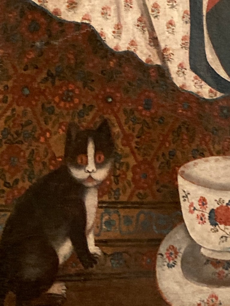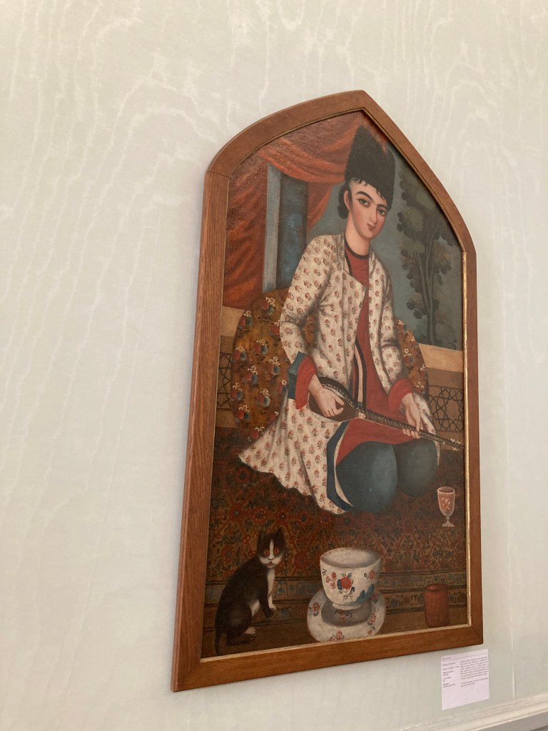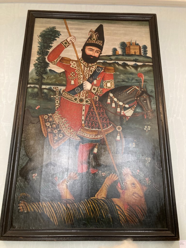 Une fois au premier étage on peut y trouver différents salons dont celui d’honneur où des œuvres kajars ornent les murs, dont le portrait de Muhammad Shah terrassant le dragon (sorte de Saint George terrassant le dragon) et le joueur de sefar avec son chat si mignon.