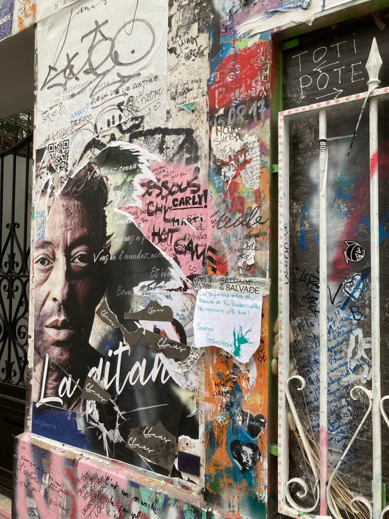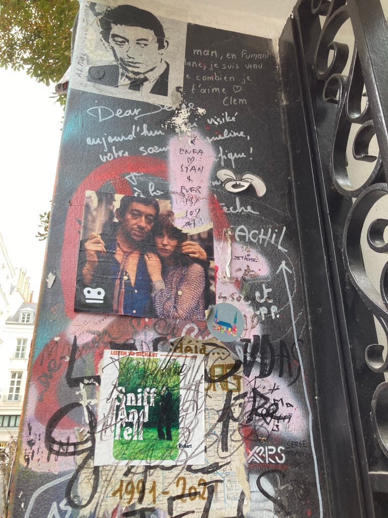 Et pour finir ma visite je suis passée devant la maison de Gainsbourg rue de Verneuil et je me suis amusée à regarder le street art qui colore les murs de la maison. Une m’a profondément émue ce sont les signatures de Gainsbourg sur les portes, son visage avec la gitane, la photo de Jane et lui et celle en noir et blanc, portrait de deux êtres disparus, et avec eux ce que cette époque représentait !