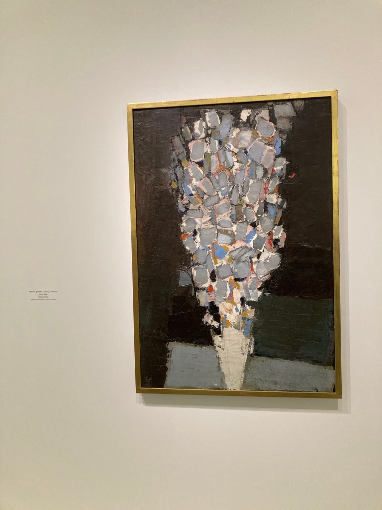 Il peint des œuvres aux formes angulaires, grises, vertes et peu à peu elles deviennent plus aériennes. Les couleurs rouges, dorées apparaissent et puis ce sont les couleurs, les fleurs dans des vases s’élevant vers le ciel en blanc, bleu et rouge. Tout est fragmenté mais terriblement aérien et léger.