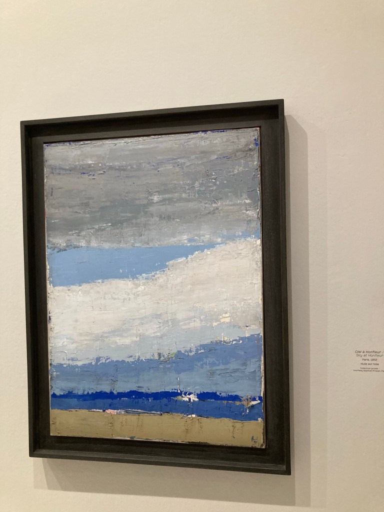 Cela contraste aussi avec la mer et les nuages du ciel à Honfleur où sable, mer et ciel bleu se mélangent pour ne faire plus qu’un et on ne sait plus où horizon, ciel et terre. J’adore ce tableau je le trouve émouvant.