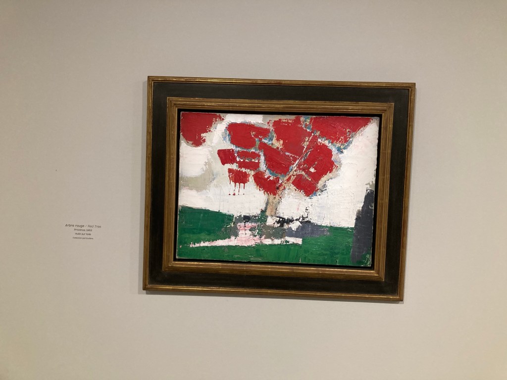 L’arbre rouge apporte lumières blanches, vertes et rouges. C’est l’expression de la fascination de Nicolas de Staël pour la Provence, le sud et ses lumières. Il s’inspire du lieu où il achète une maison à Ménerbes. Il exprime « ses paysage des marches ». Tout est éclatant !
