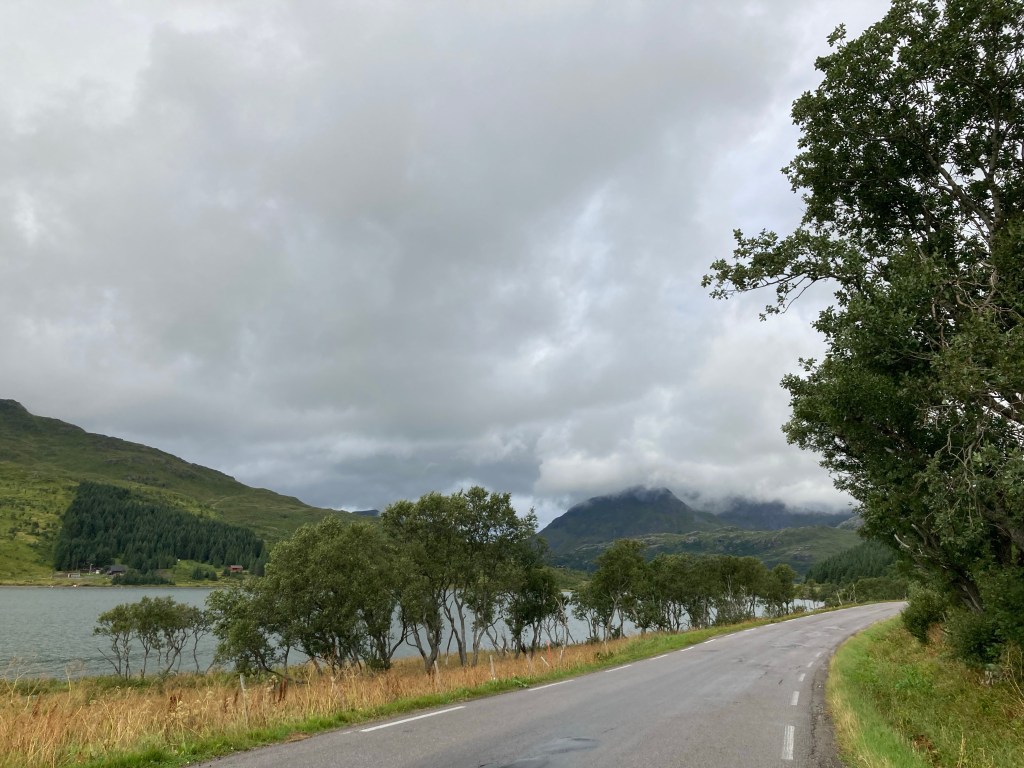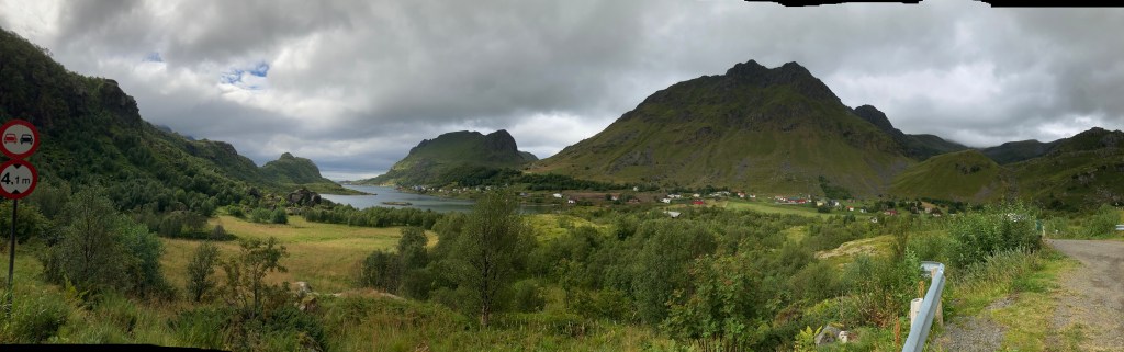 Un repos bien mérité avant de reprendre la route et de repasser les deux tunnels avec un arrêt sur le côté pour regarder le paysage et la vue sur Unstad. Cette dernière s’éclaircissait et le fjord devenait plus verdoyant et accueillant qu’à l’aller. Les monts ressemblaient à des tétons pointés vers le ciel et les prairies étaient parsemées de saules frêles. En contrebas on apercevait le village.