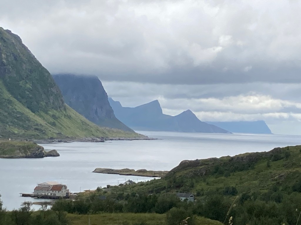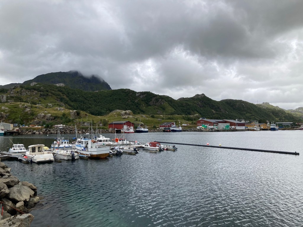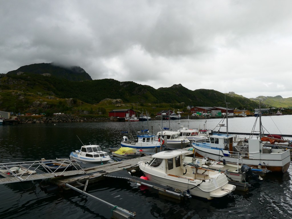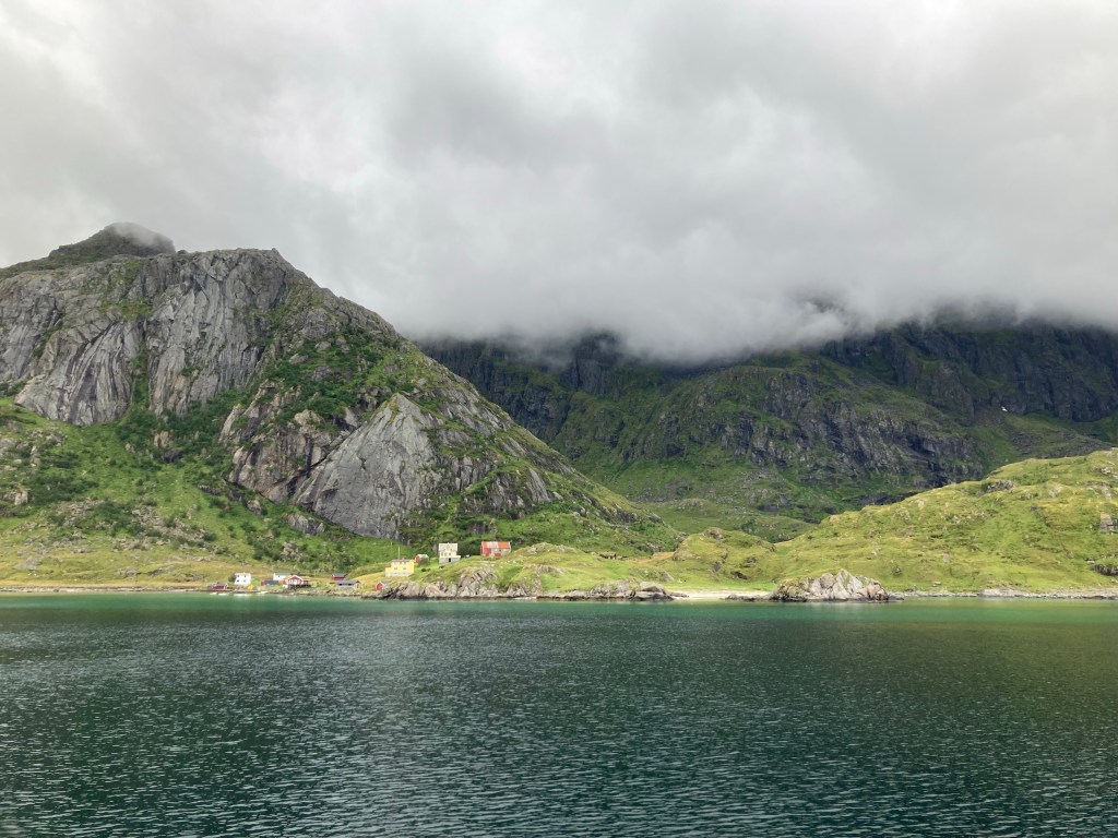 Je suis allée me balader à pied le long de la jetée pour voir les villages en face en bas de la colline. Des maisons miniatures jaunes, blanches, rouges étaient éparpillées au bord de l’eau. Le vent soufflait comme un damné. Je regardais la vue sur le fjord qui s’assombrissait au fur et à mesure que je marchais sur la jetée. Le fond était bouché par les nuages. Les montagnes se confondaient presque dans la mer.