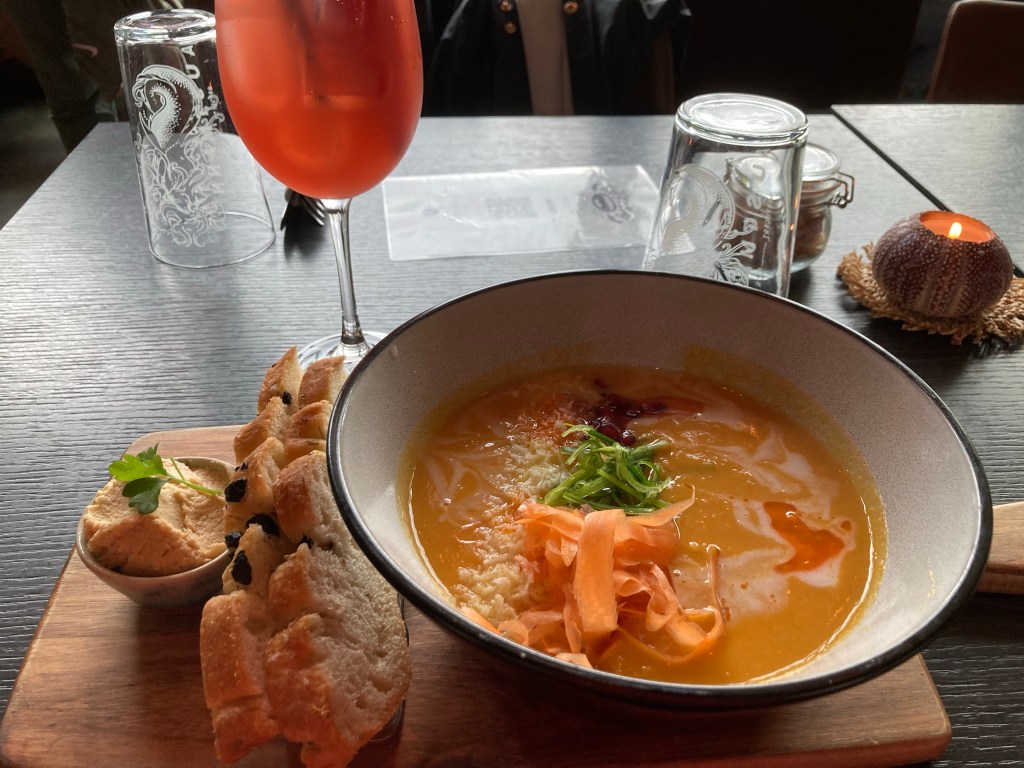 Comme j’avais une faim de loup j’ai dégusté une soupe de carottes et gingembre avec du pain local sorte de brioche italienne accompagnée d’houmous. Un vrai délice ! Et j’ai aussi bu un jus de gingembre rhubarbe à se damner !