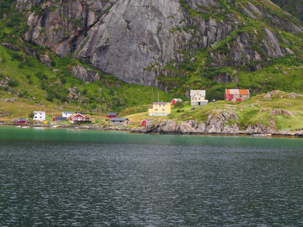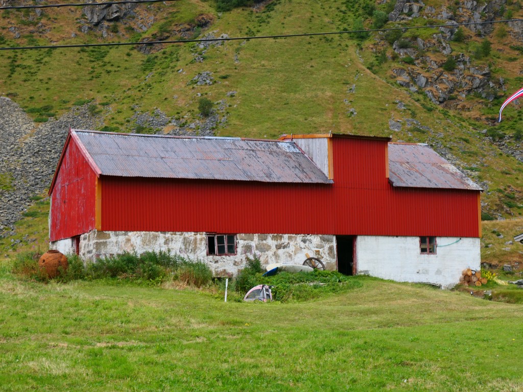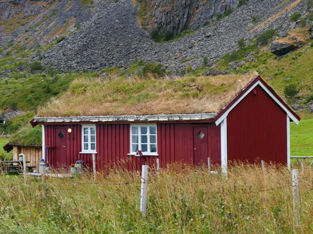 Une jolie petite maison aux vitres dont les carreaux sont étroits, appelé torbu rouge avec des herbes sèches sur le toit – traditionnel sur les iles Lofoten. Et d’autres immenses, moitié en pierre et en bois rouge.