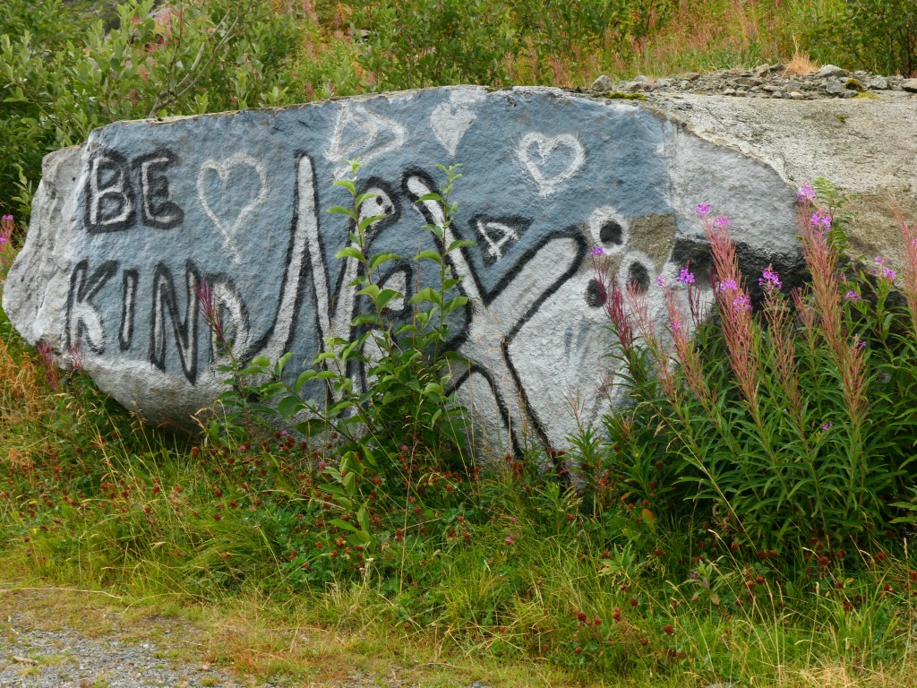 J’ai opéré un demi-tour avant de prendre une giboulée sur la tête. Un chemin sur la droite menait à des séchoirs de stockfishs et un graffiti avait été dessiné sur une roche – sorte de gros galet – avec l’inscription « Be kind » et des petits cœurs. Clin d’œil !
