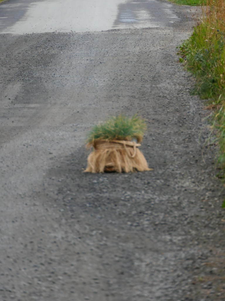 Je poussais donc jusqu’à Tangvag pour en découvrir les beautés. La route était parsemée de petits arbres dont les troncs étaient posés sur de la paille bien jaune. On apercevait au loin le fjord qui s’écartait en deux bras bien disjoints avec le port sur la gauche et un village sur la droite.