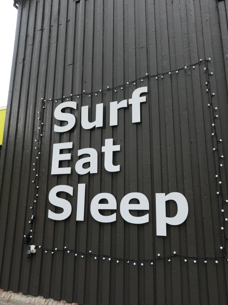 En faisant demi-tour et me dirigeant vers le restaurant Unstad Artic Surf avec comme logo « Surf Eat Sleep », j’ai découvert une jolie fresque en forme de gros chat ou tigre sorte de mantra indien coloré et très inhabituel pour la région. Contraste et attraction du coin !