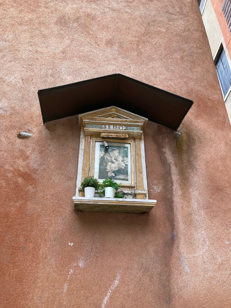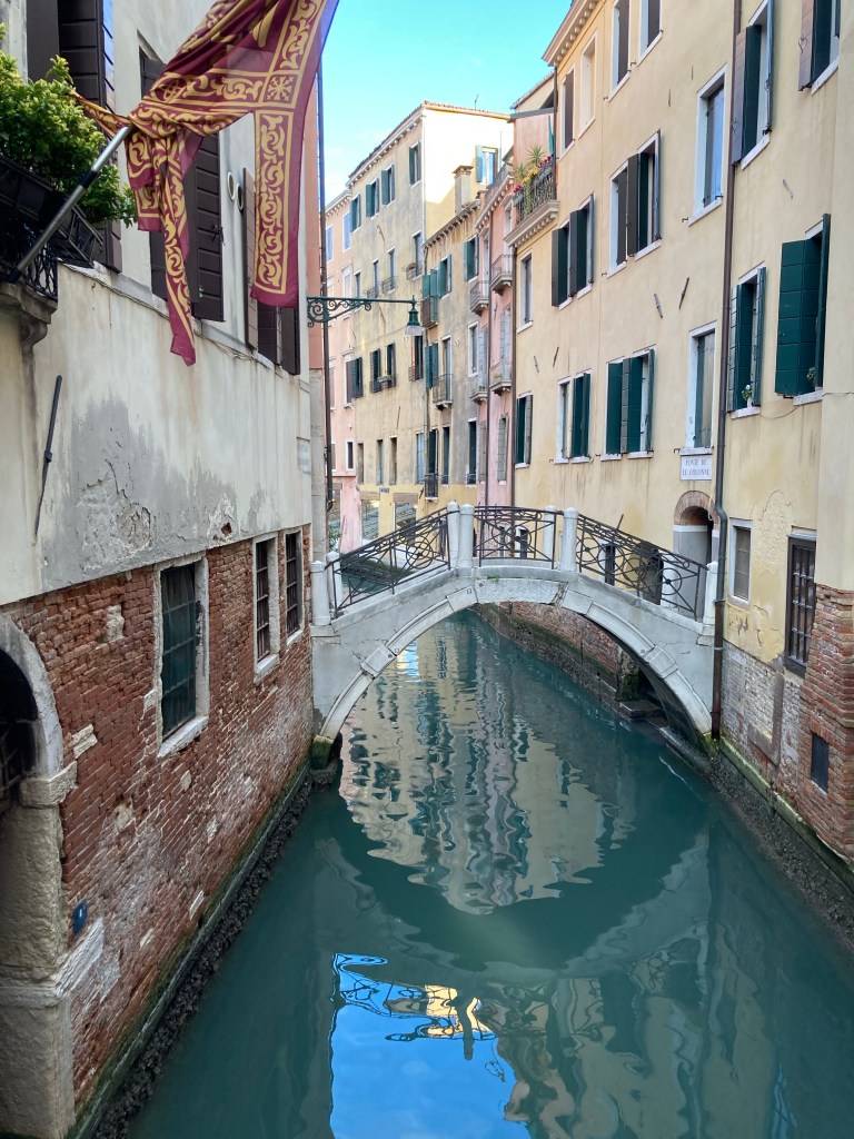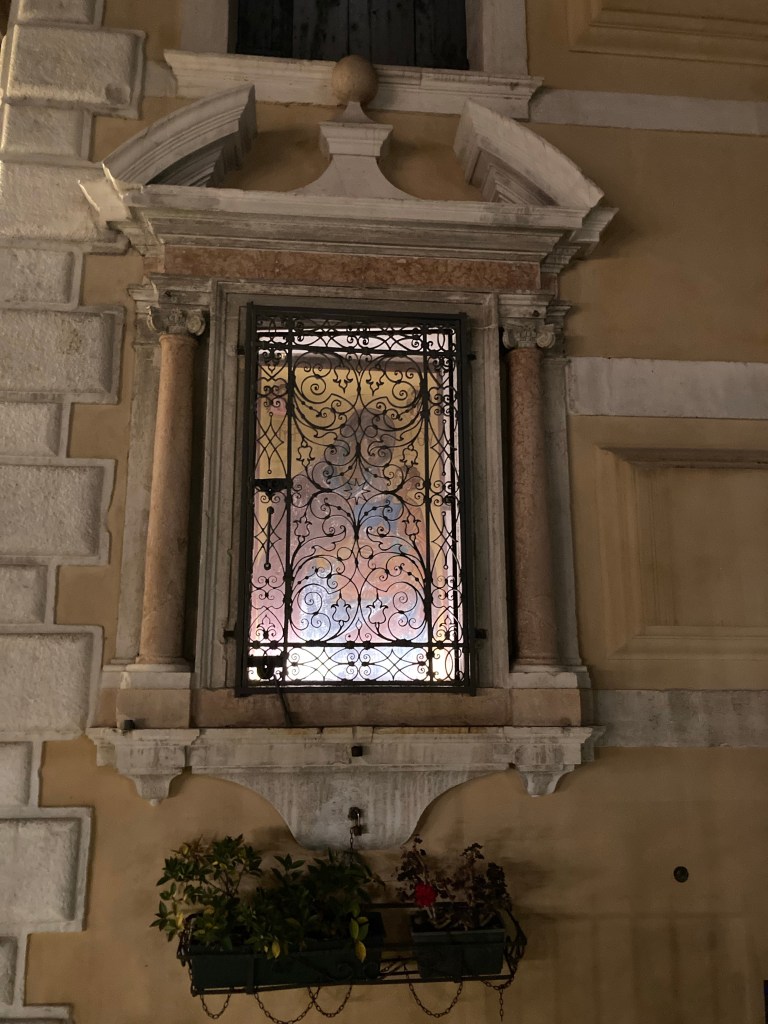 Installée non loin de l’église San Zacharia, je me suis jetée à corps perdue dans les petits canaux qui déroutent et vous font évoluer dans Venise. L’idée était de découvrir les bas-fonds et les arrières-fonds pour rejoindre La Fénice. Quitte à se perdre – au moins on découvre des lieux insolites, des ponts et des rues qui sont des culs de sacs ! Mais la beauté est partout entre des maisons à avancées de vitre, de ponts aux grilles travaillés, des lieux de prière en extérieur représentant un saint avec des fleurs ou des plantes vertes posées devant. Des cours avec des puits, ces canaux où se reflètent les couleurs des pierres en brique des palais, des remous qui donnent à l’eau une couleur verte spéciale que l’on ne trouve qu’ici. Parfois une autre surprise vous attend dans une cour où un escalier grimpe dans un palais et des plantes sont agrippés à cet endroits le rendant magique. On ne se lasse jamais de Venise.