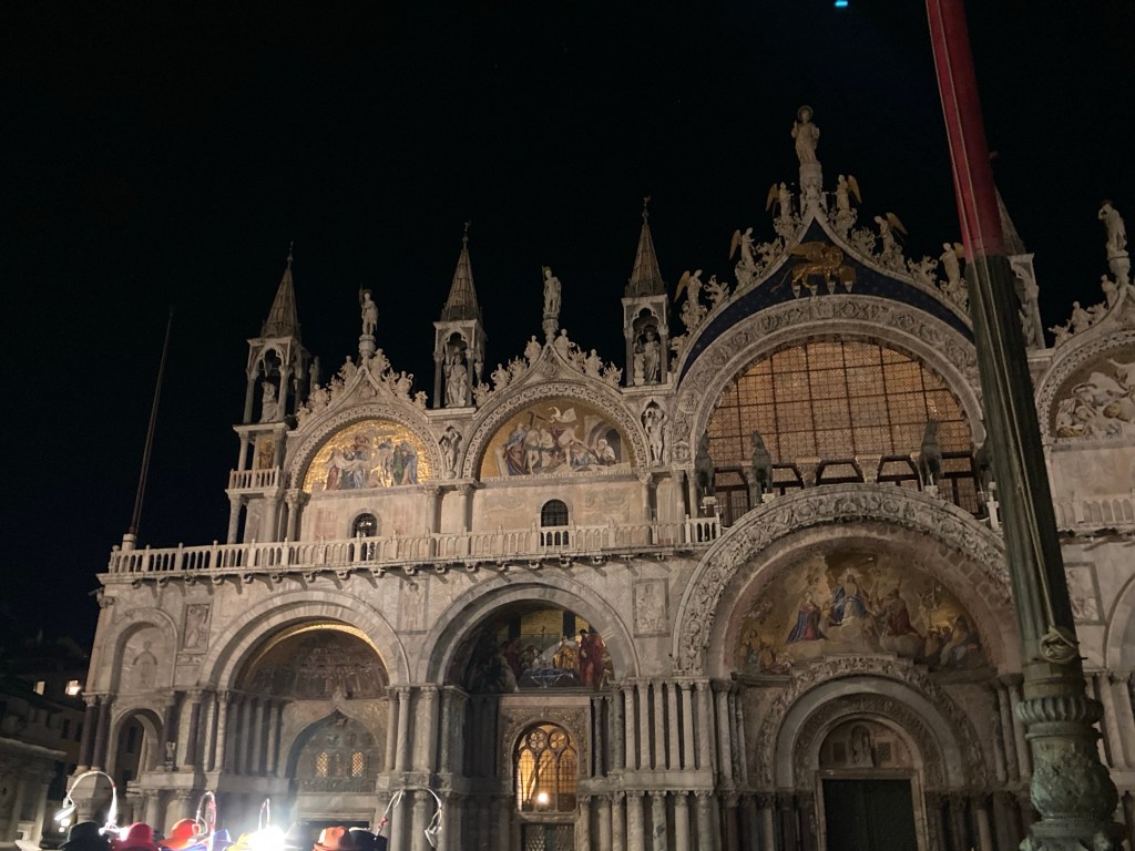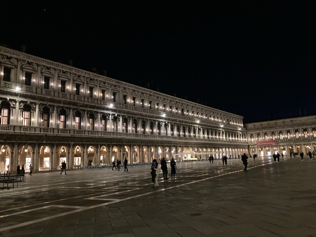 La place Saint Marc devient une piste de danse où le marbre se reflète dan les lumières et où l’eau de l’aqua alta laisse des traces sur le marbre les entourant de reflets blancs. L’horloge astrologique reprend des couleurs blanches et devient imposante. L’église Saint Marc brille et l’intérieur se pare de ses reflets dorés. Les fresques se réjouissent pour briller et nous faire découvrir leurs beautés. Chaque demi-coupole nous offre un spectacle sur la vie de Saint Marc et du Christ. Les eaux du canal du pont des soupirs nous glacent les sens en pensant à ceux qui jugés finissaient en prison, dans l’humidité et la terreur. Les palais s’enluminent. On peut apercevoir les arbres de Noel et les plafonds en bois des appartements. Tout est lumière tamisée, atmosphère feutrée au son des gondoles qui glissent sur l’eau et des chuchotements.