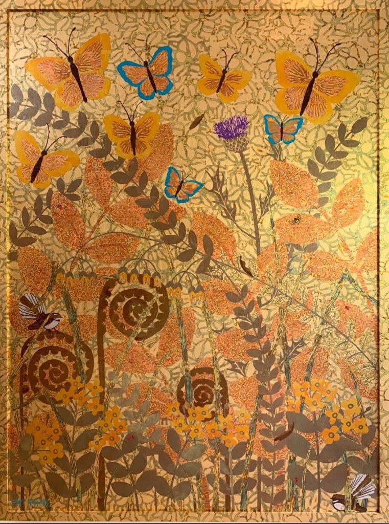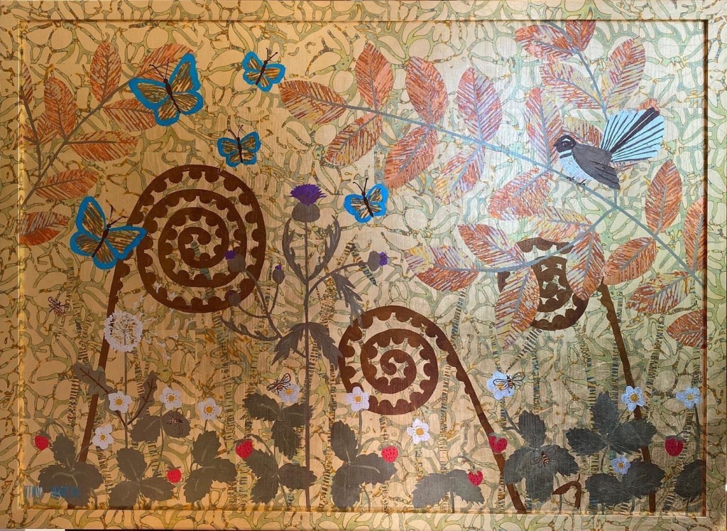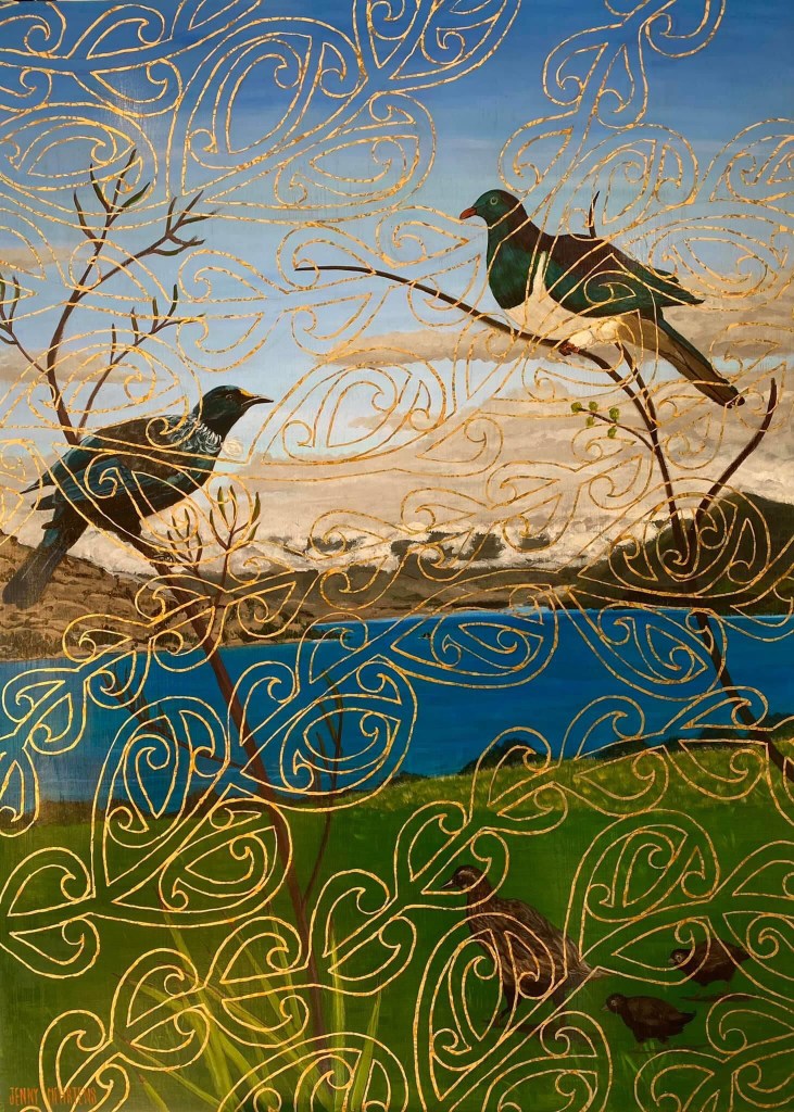 On retrouve le mélange de cette nature tendre et violente, le faciès des Maoris peints de tatouages ayant des significations que je ne sais dépeindre. Sur les visages la nature décore les visages d’oiseaux locaux comme le pigeon néo-zélandais, les feuilles des arbres, les tiges des feuilles de fougères dites kori, si délicates lorsqu’elles sont enroulées, où les éléments se partagent l’homme et la vie. Les kiwis (l’oiseau) sont représentés pour montrer le côté éphémère de la vie et de leur passage sur terre. Et puis les lacs sont très présents dans ses tableaux comme les papillons qui volent sur les visages et les teintent de légèreté. On y trouve aussi des baies sauvages, des chardons mauves et toutes les fleurs qui caractérisent la Nouvelle Zélande.