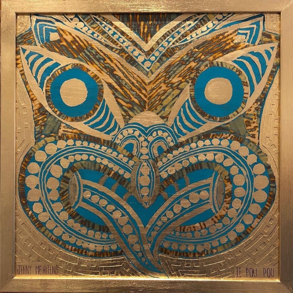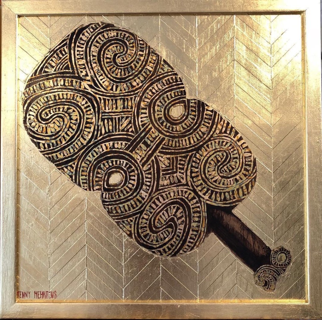 Jenny Mehrtens peint aussi des Tiki qui font référence aux premiers hommes maoris arrivés en Nouvelle Zélande qui aujourd’hui sont un talisman et surtout un lien spirituel avec les ancêtres. Il est dit qu’il apporte la chance et la fertilité. Pour les Maoris c’est un trésor.
