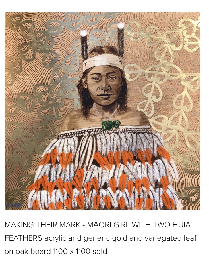 Et puis elle peint des personnages maoris avec leurs plumes et leur pierre verte de jade attaché au cou ou bien des enfants accrochés, enserrés dans un kakahu dans le dos.