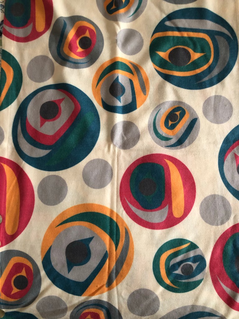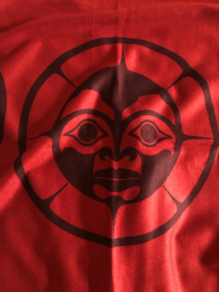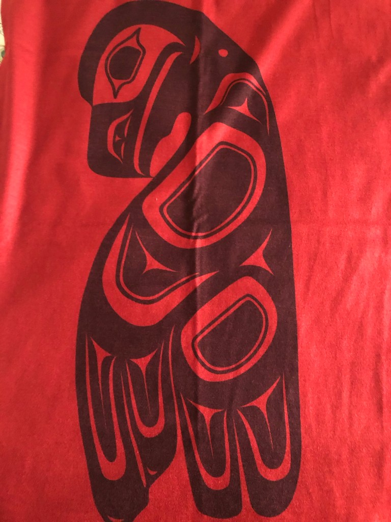 J’ai retrouvé les peintures stylisées des cultures Haida avec les aigles, les orques, les baleines avec des inclusions de nacres et aux tissus entourés de boutons de nacres. Ses tissus rouges et noirs qui représentent des aigles ou des baleines. La nature y est aussi présente et y porte l’homme dans son humanité et le temps de la mémoire. Là-aussi tout leur mode de vie est tourné vers la mère Nature, la mer et à terre à qui ils doivent tout ; le lien entre cette terre Nature, cette mer voire mère Nature et les esprits qui façonnent leurs vies ; la vie en communauté qu’ils partagent tous. Leur religion est le respect de la nature.