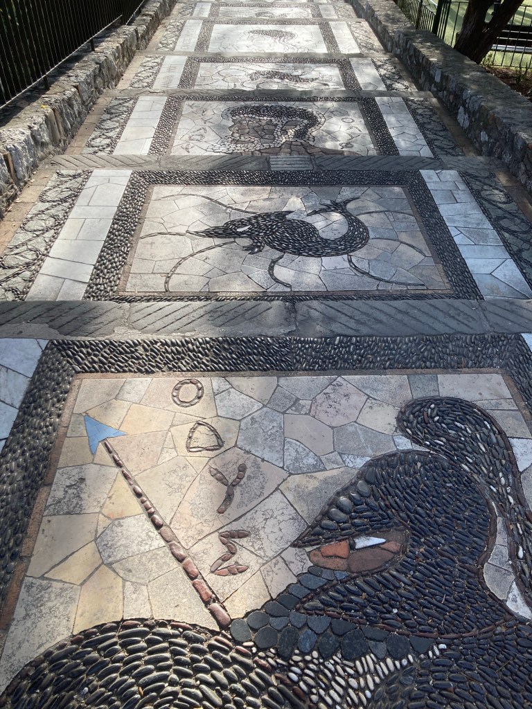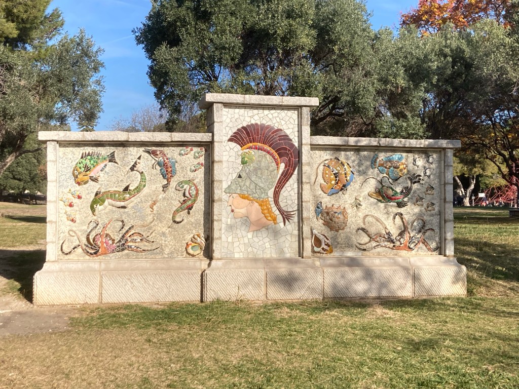 Des œuvres et des mosaïques faisaient un rappel des mythes de la Grèce antique. De très beaux arbres ornaient ce lieu. Des arbres avec des feuilles jaunes non tombées et des fleurs roses jouaient sur les contrastes. Et le soleil était toujours présent.