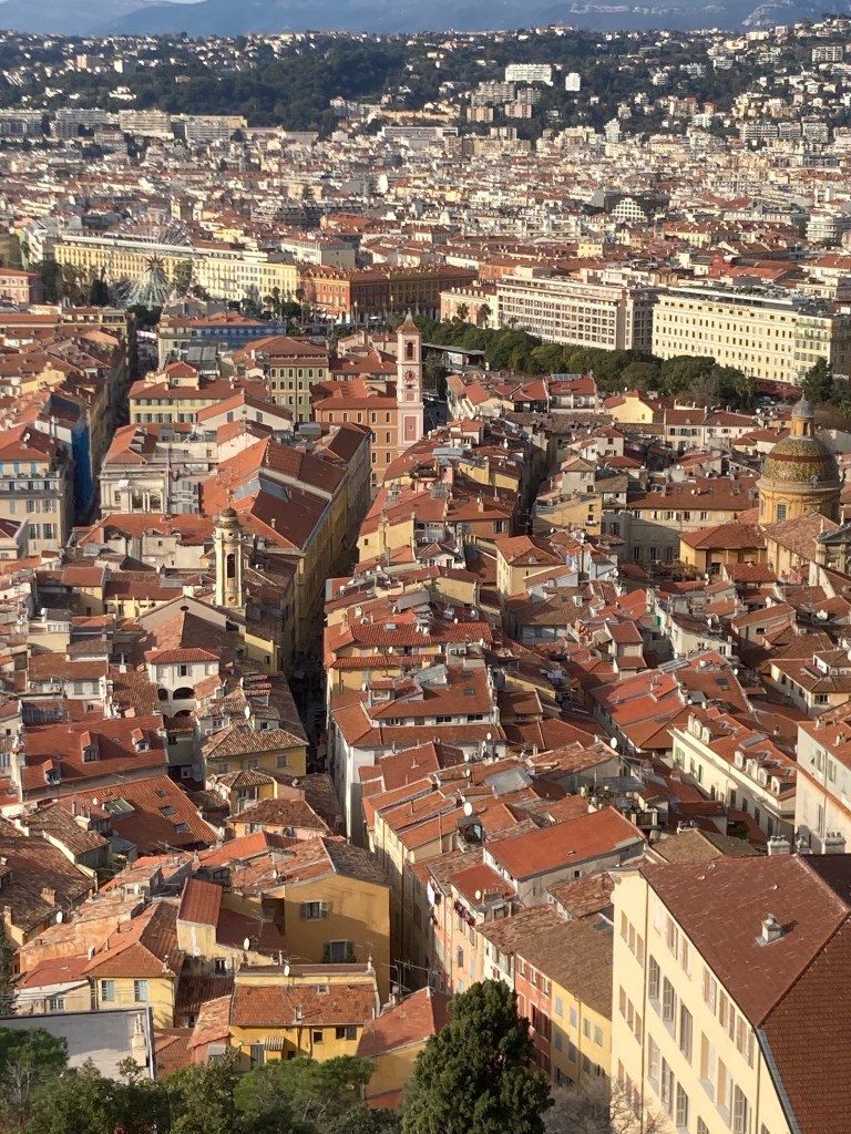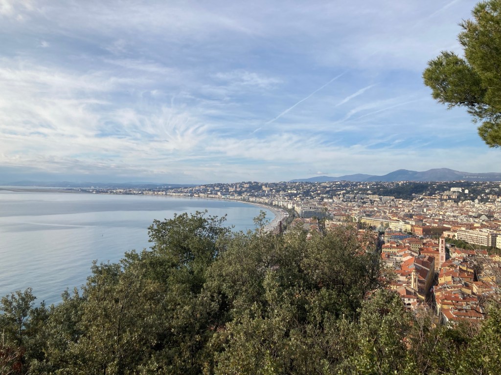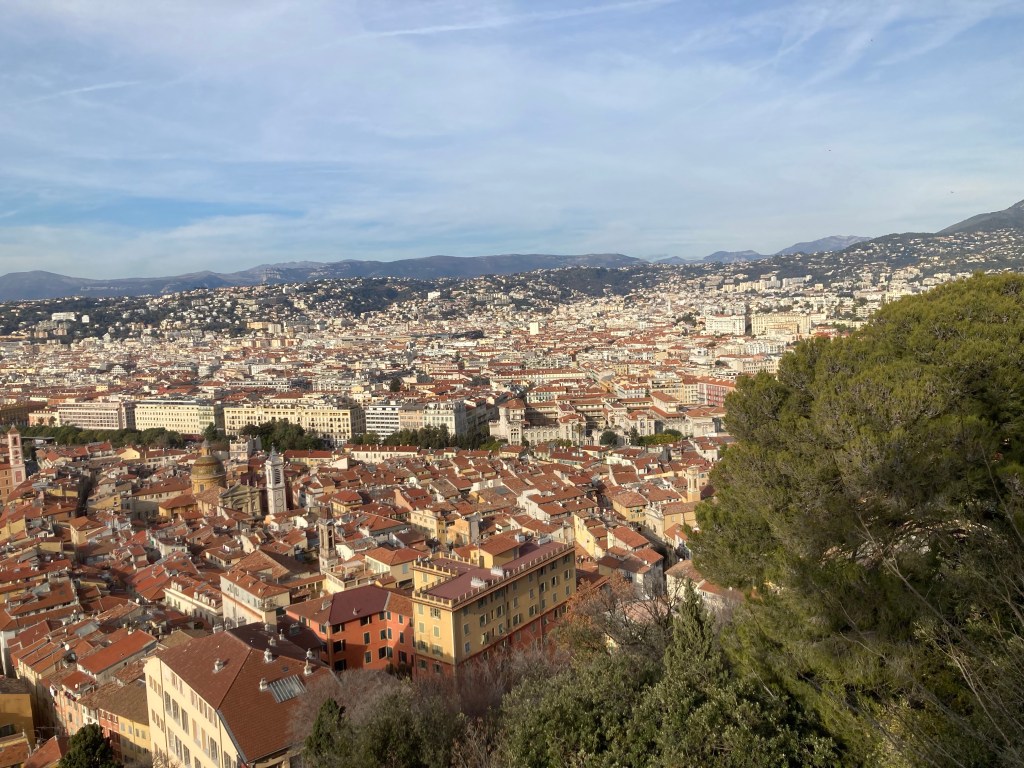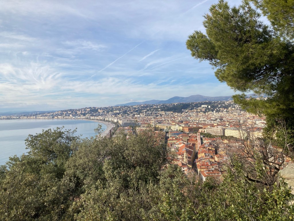Parmi les cyprès, les arbres, Nice se dévoilait dans toute sa grandeur et sa splendeur. Les montagnes verdoyantes dans le fond, la ville au premier plan qui comme une longue langue de couleur orangée se lovait entre la mer et les monts. Le tout incurvé s’offrant aux touristes et à ceux qui y vivent.